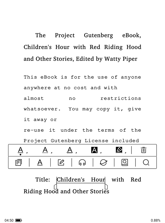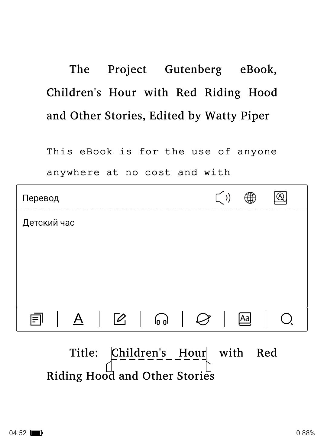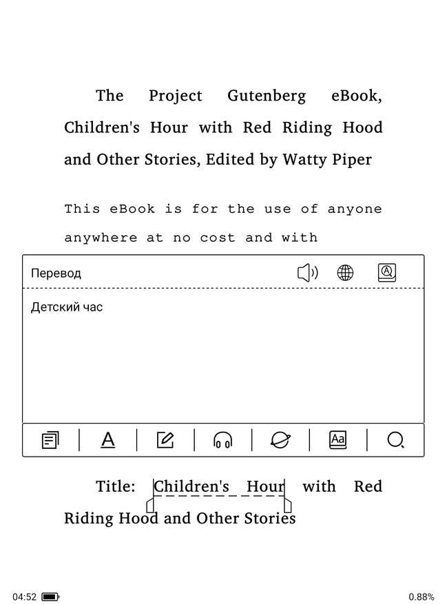 Сенсорный экран чувствительный и им удобно управлять интерфейсом устройства. С оговоркой на скорость прорисовки экрана в данной технологии удобно масштабировать, выделять текст, вводить комментарии, искать в словарях и википедии. Разумеется, если есть необходимость, можно сразу переводить текст при помощи встроенного онлайн-переводчика на все языки.