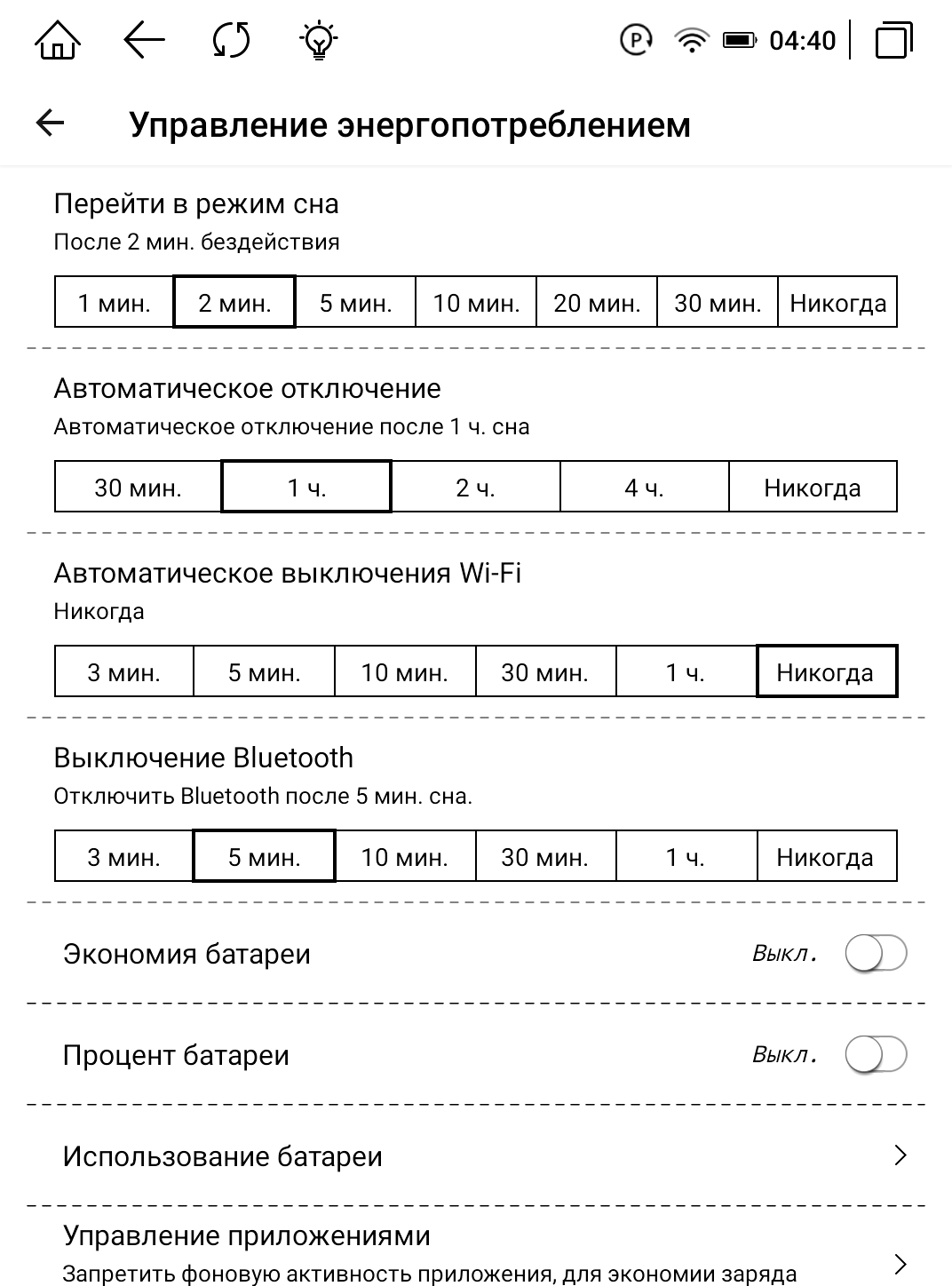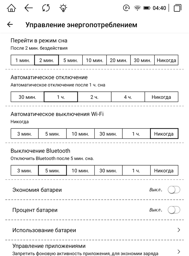 Аккумулятора на 2200 мАч хватает до 35 дней в режиме ожидания. По статистике большая часть людей читает примерно 1 час в день. Исходя из этого факта, заряда аккумулятора хватит на 12 часов в цветном режиме без подсветки и с выключенным Wi-Fi, Bluetooth. А с подсветкой в режиме «День» устройство продержится примерно 10 часов.