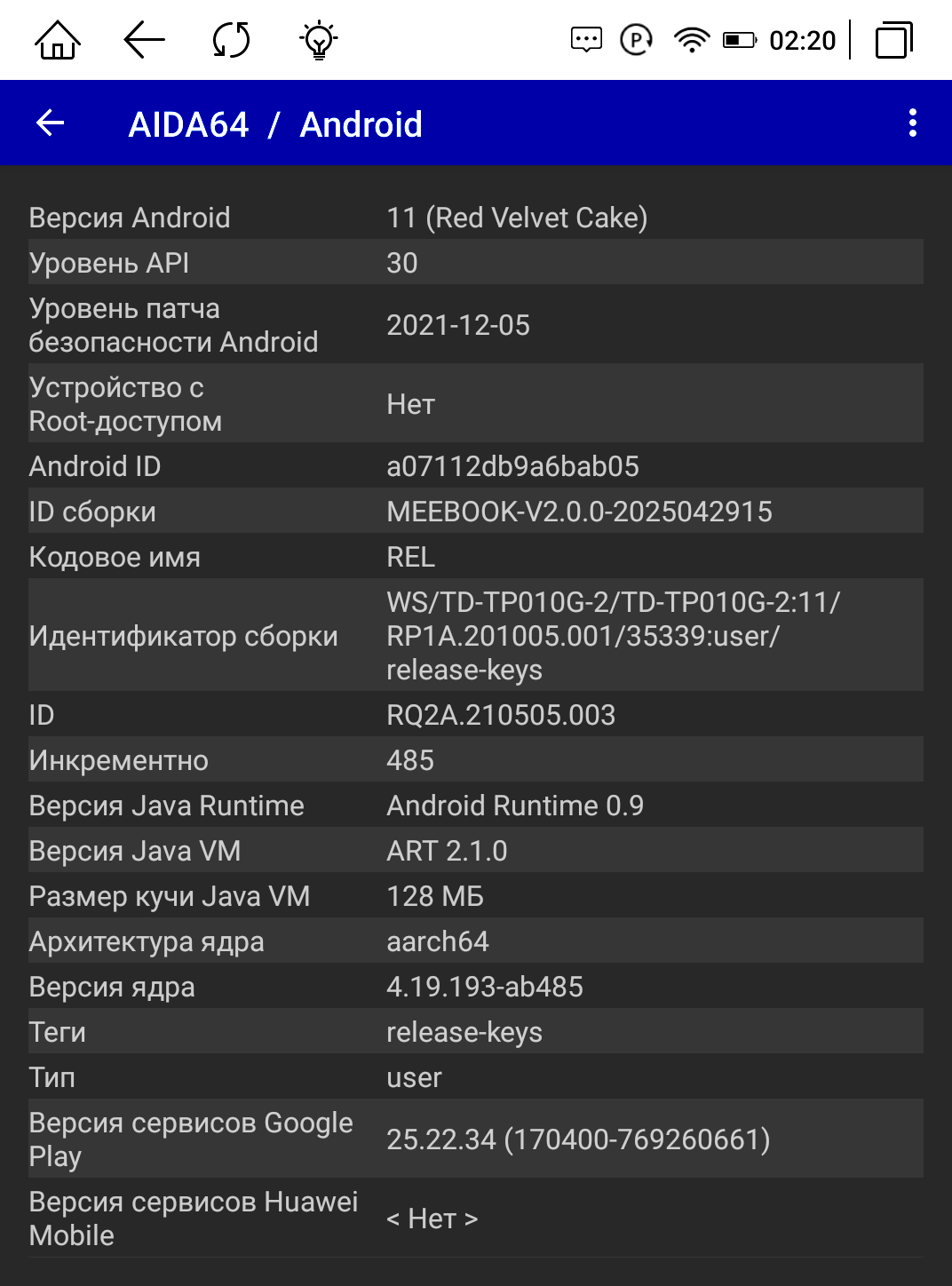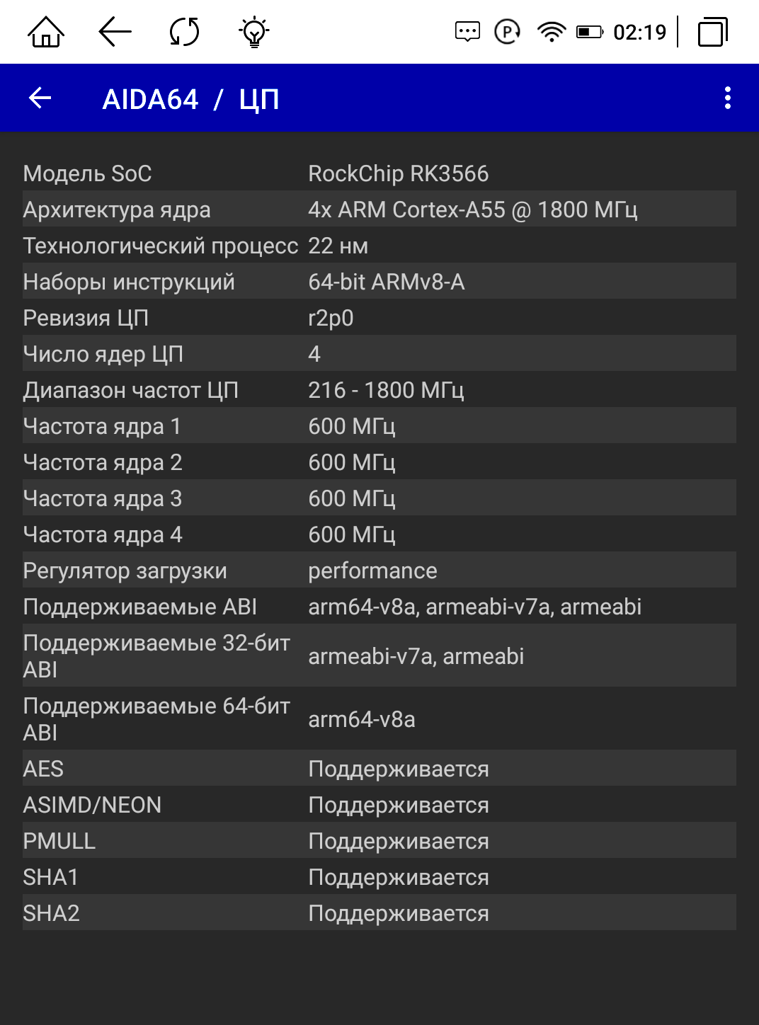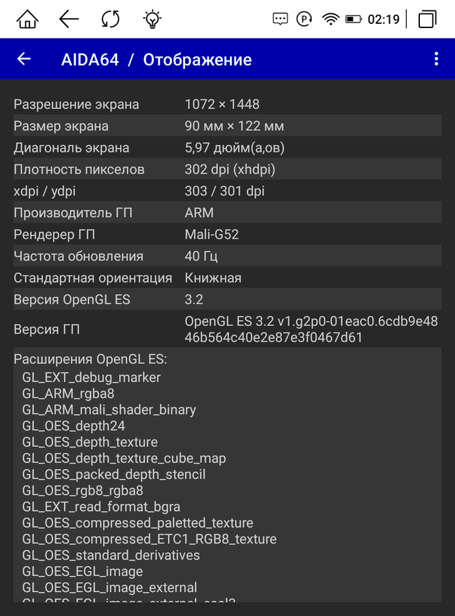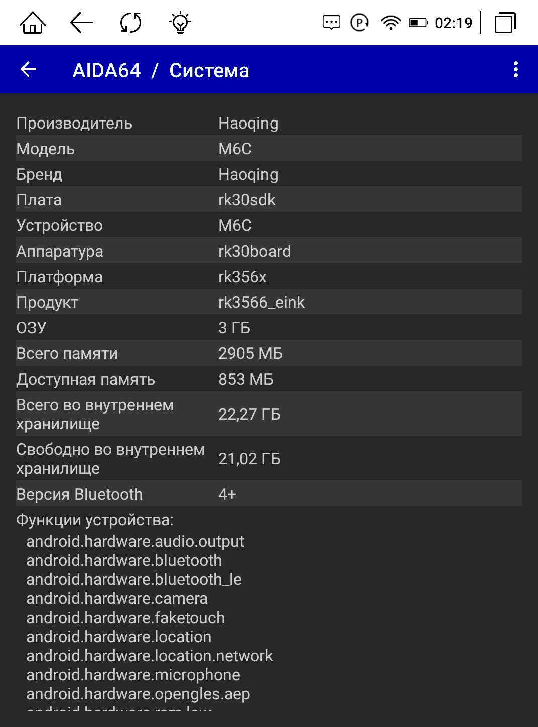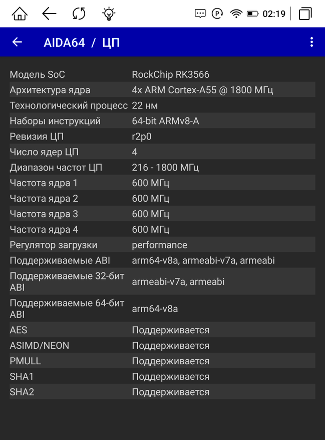 Благодаря поддержке Google Play и RuStore мы можем скачивать любые программы на устройство, а значит устанавливаем AIDA64, чтобы проверить, какое железо поставлено в книгу. Оперативной памяти 3 ГБ. Работает электронная книга на процессоре RockChip RK3566 с 4-мя ядрами и частотой 1800 МГц. Диагональ экрана 5,97″ с разрешением 1448 х 1072 пикселей. Модуль Wi-Fi поддерживает диапазон 2,4 ГГц. Версия Android 11, все заявленные характеристики соответствуют действительности.
