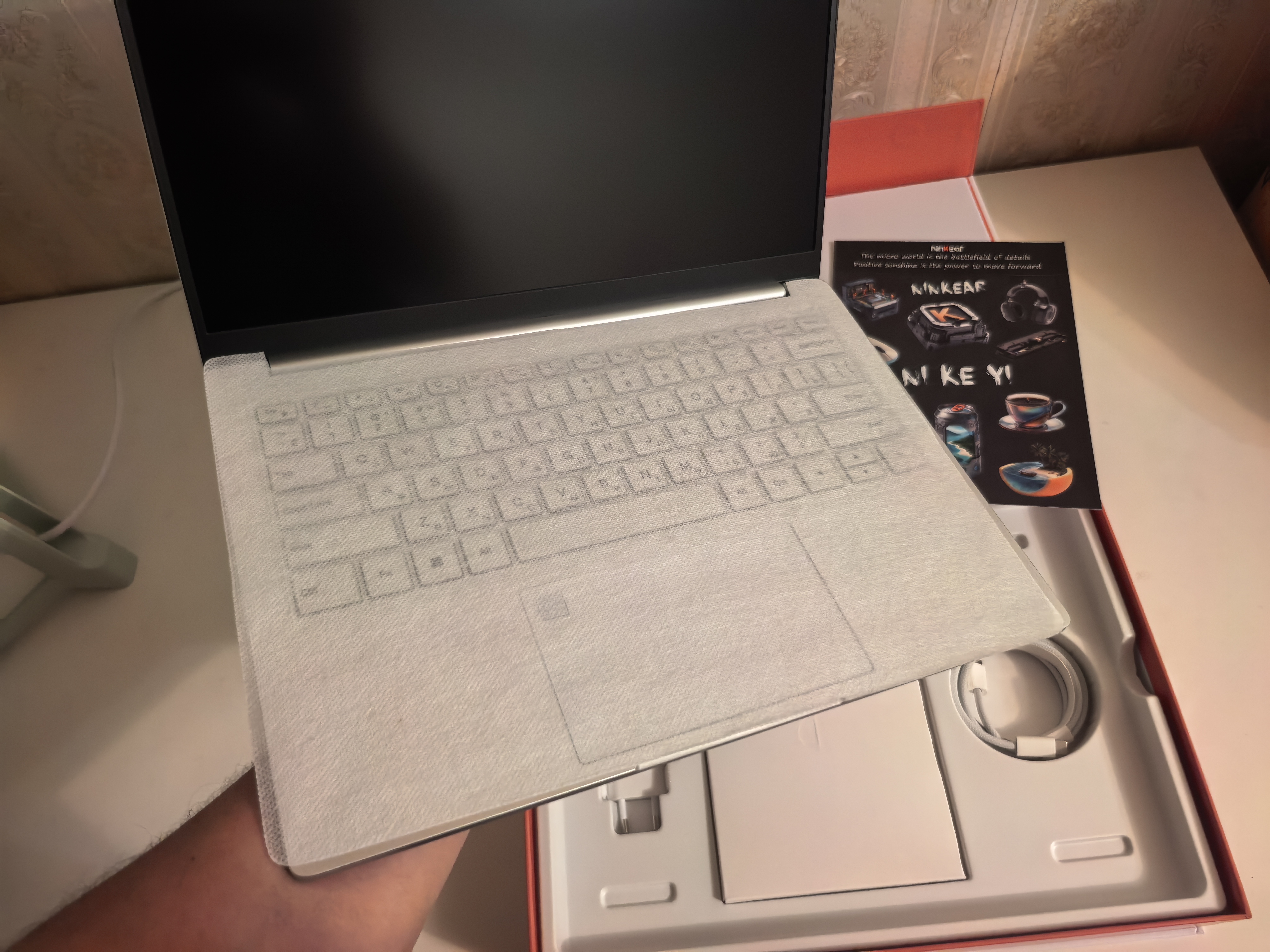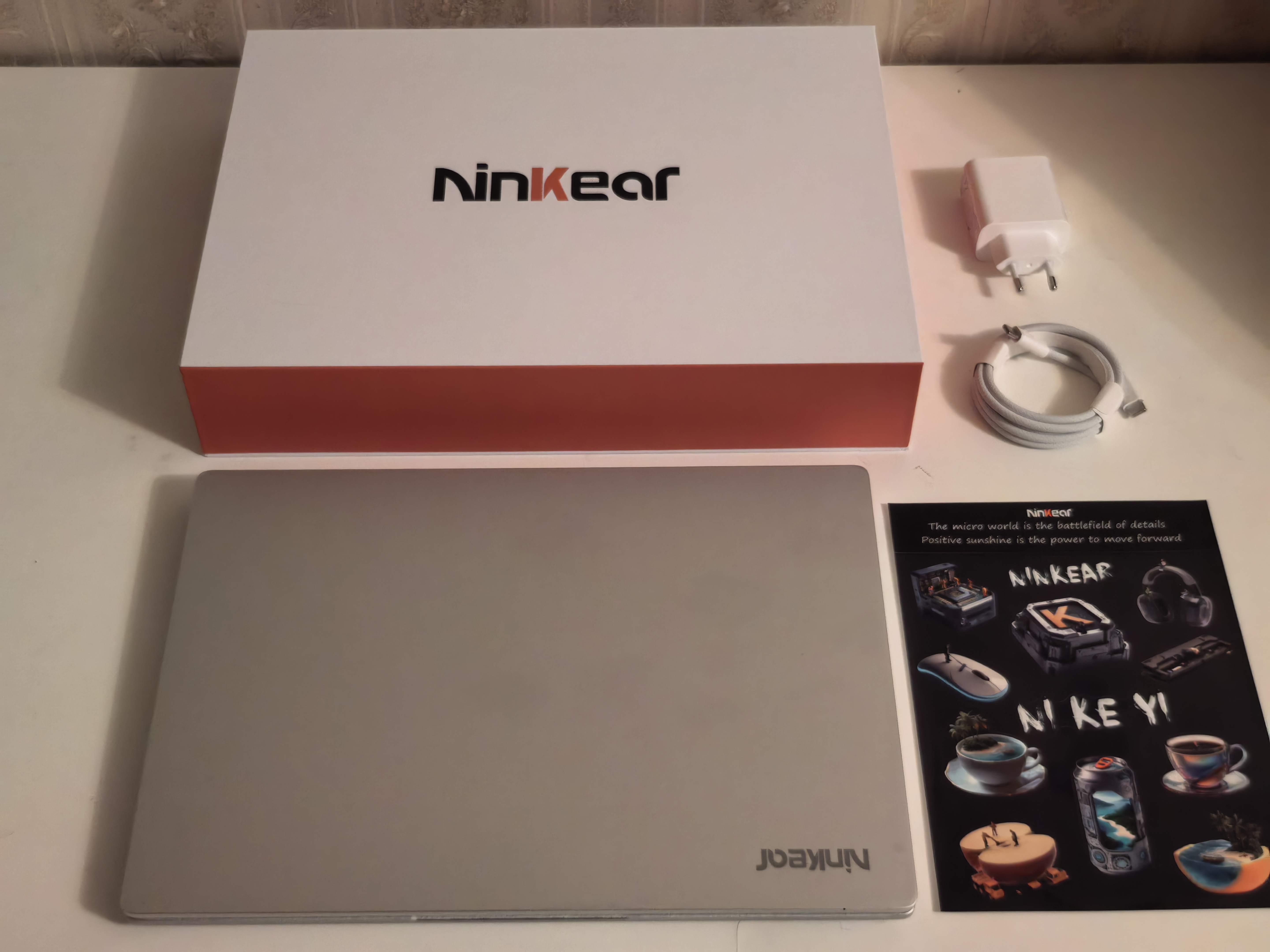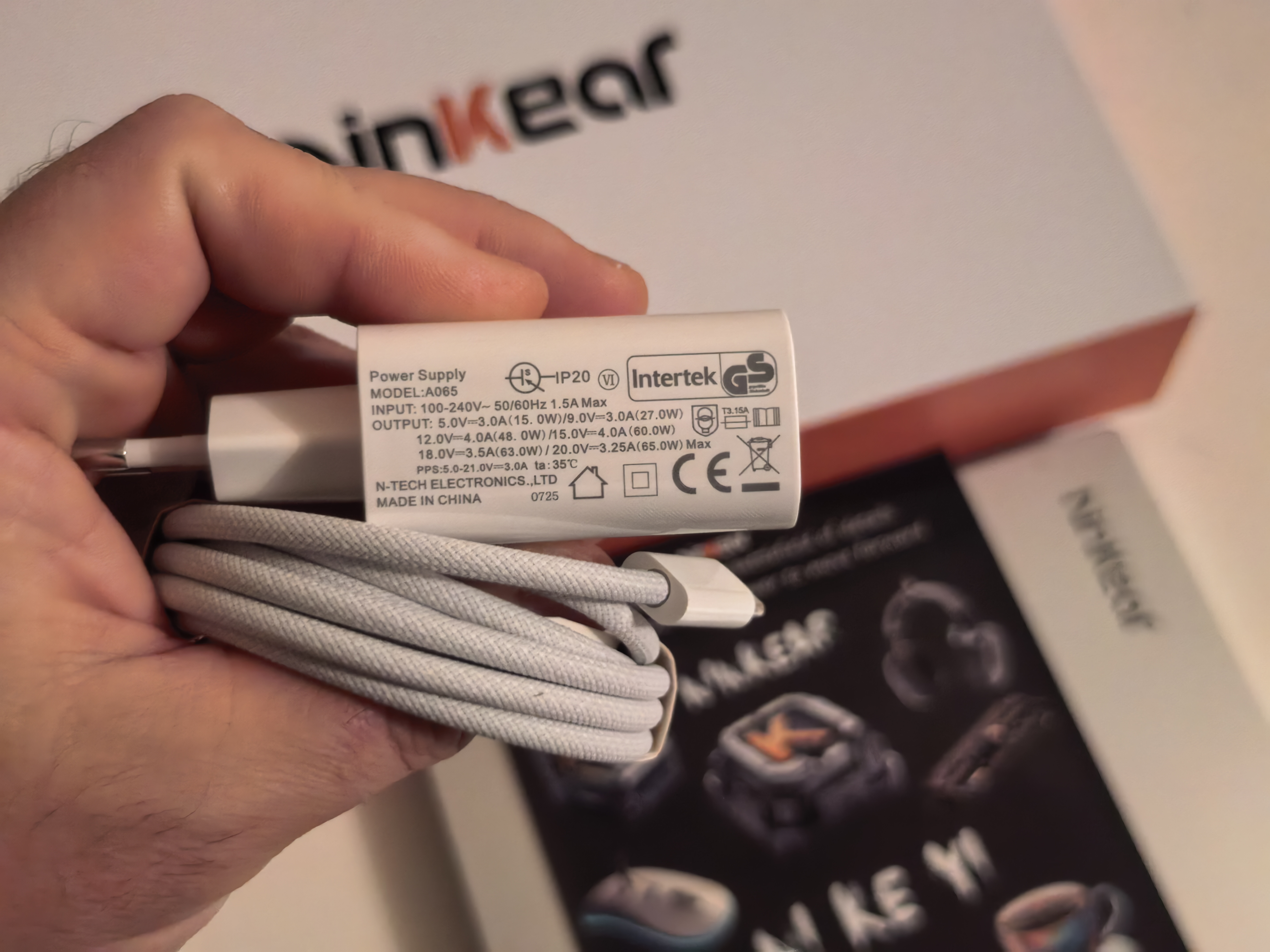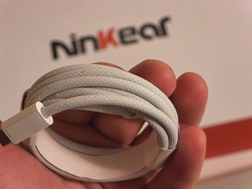 Внутри упаковки есть зарядный блок на 65Вт, плетеный кабель USB-C USB-C для заряда, ноутбук и наклейки Ninkear. Как сказал ранее, есть еще подарочные коврик и мышка.