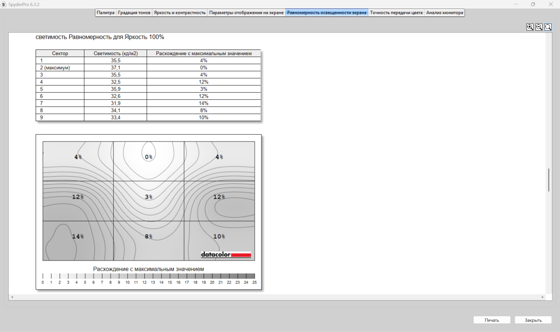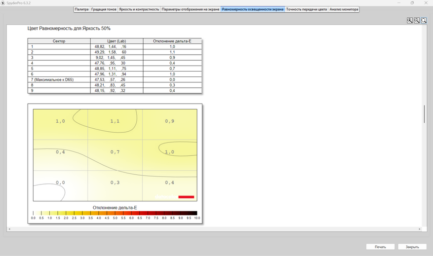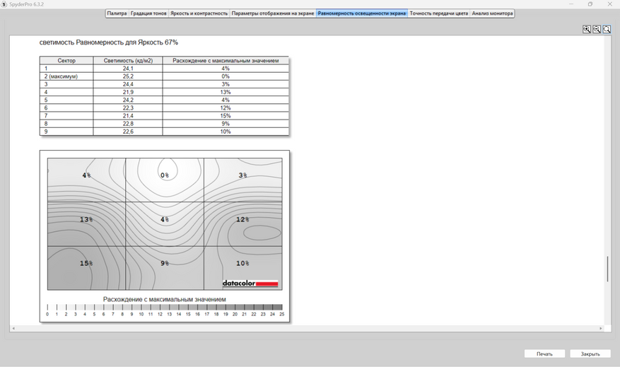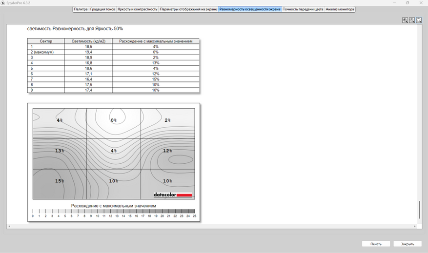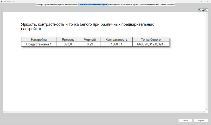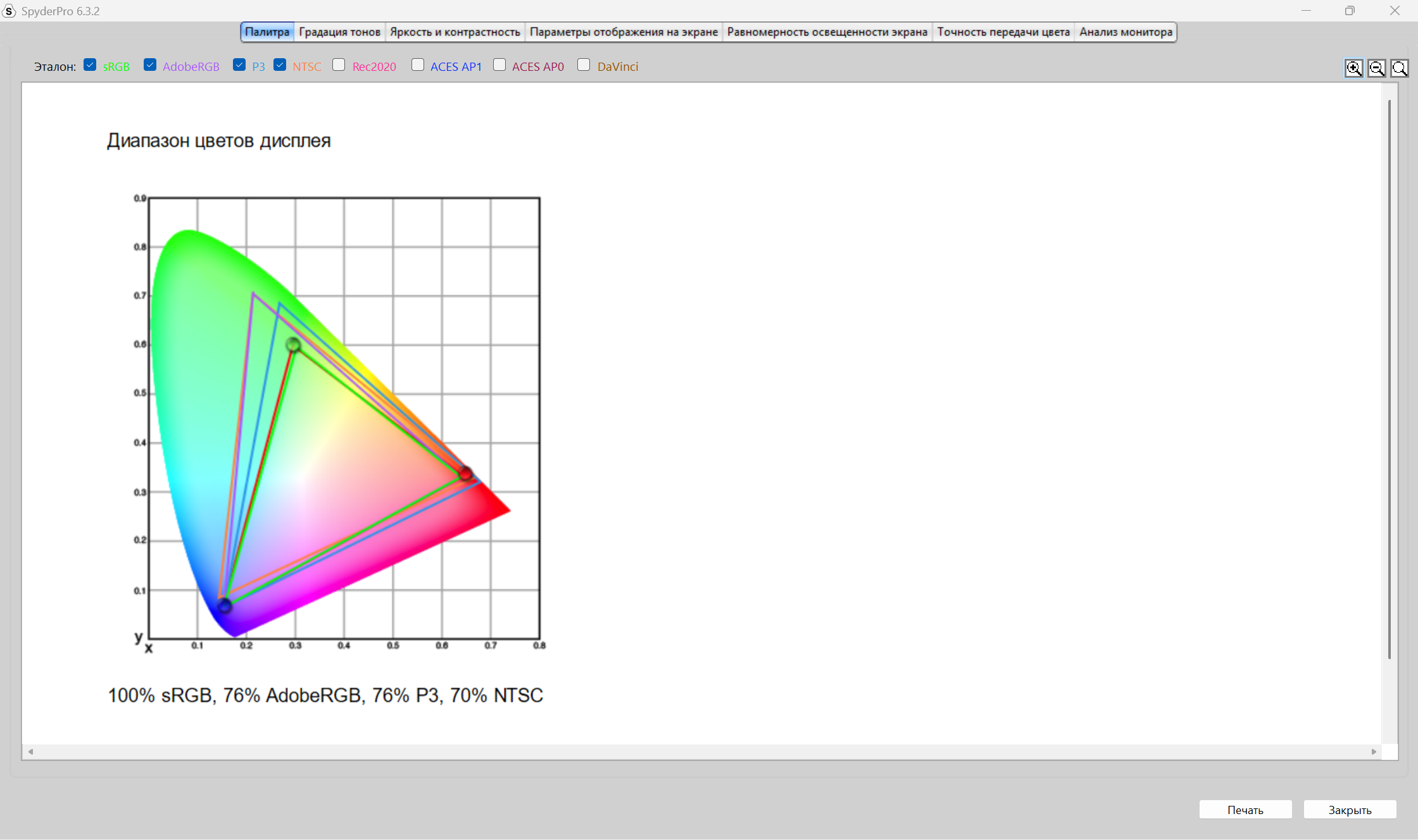 Теперь пришел черед получения оценок качества дисплея от прибора Datacolor Spyder Pro. Как сказал выше, оценивание происходит по стандартам ANSI. Полученные результаты будут в большей степени соответствовать заявленным характеристикам. В отличие от профессионалов в оценивании качества экранов на глаз и без специальных приборов, я не могу сходу сказать, какие засветы по углам, как меняется яркость в зависимости от подсветки, как хорошо передаются цвета и, тем более, я не могу сходу, посмотрев на картинки с монитора, заявить о его уровне охвата разных цветовых диапазонов, как sRGB, DCI-P3 и других, а тем более говорить о качестве и скорости перехода от темных к светлым оттенкам цветов, что отрисовается гаммо-кривой. Я, к сожалению, не такой профессионал, как другие, поэтому использую инструмент и вижу, что sRGB покрывается полностью, AdobeRGB и P3 на 76% каждый, NTSC на 70%. Характеристика от продавца о 100% покрытии sRGB подтвердилась.