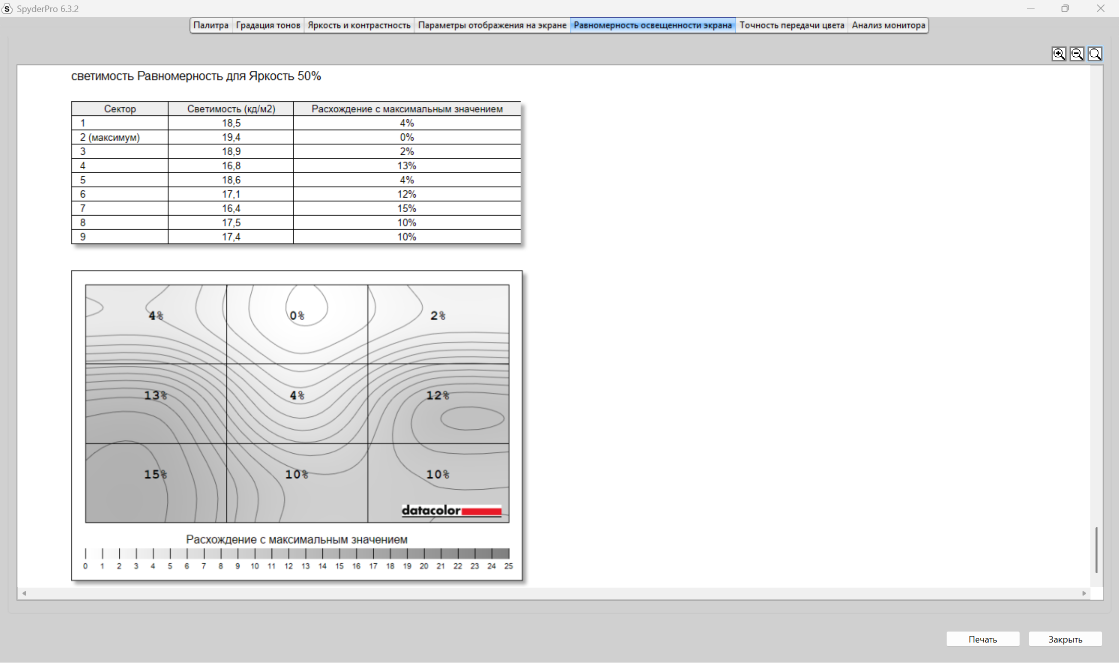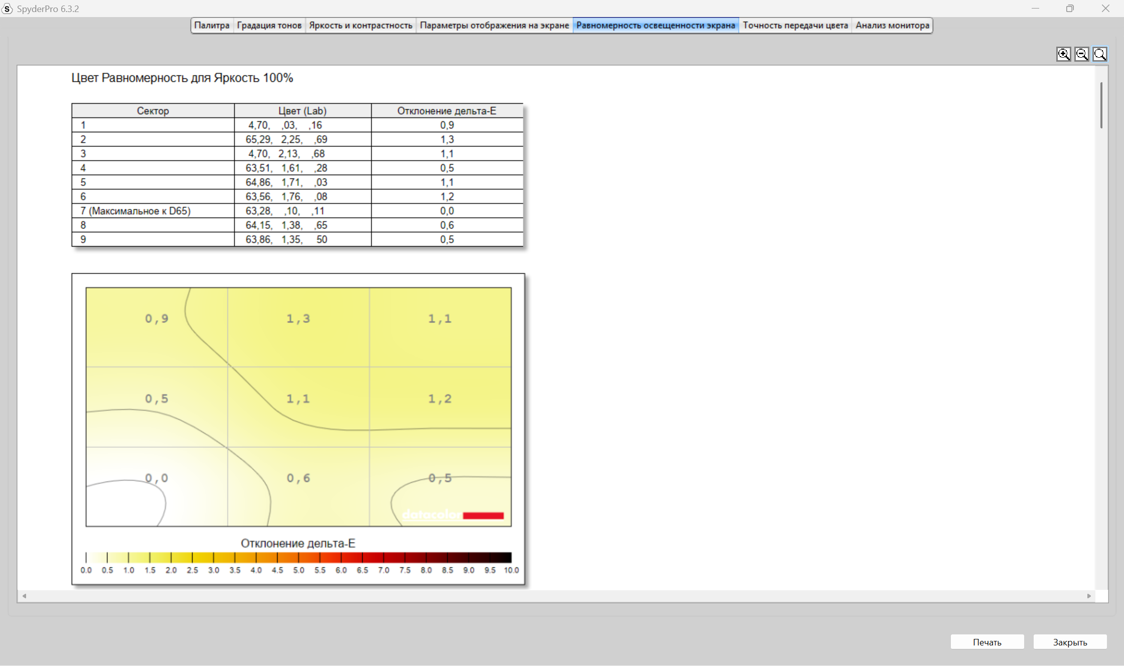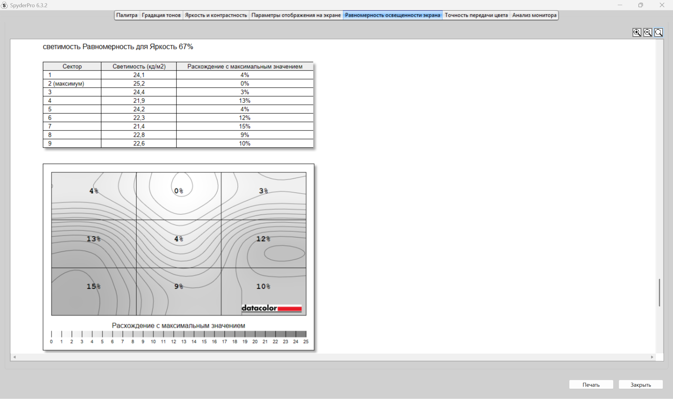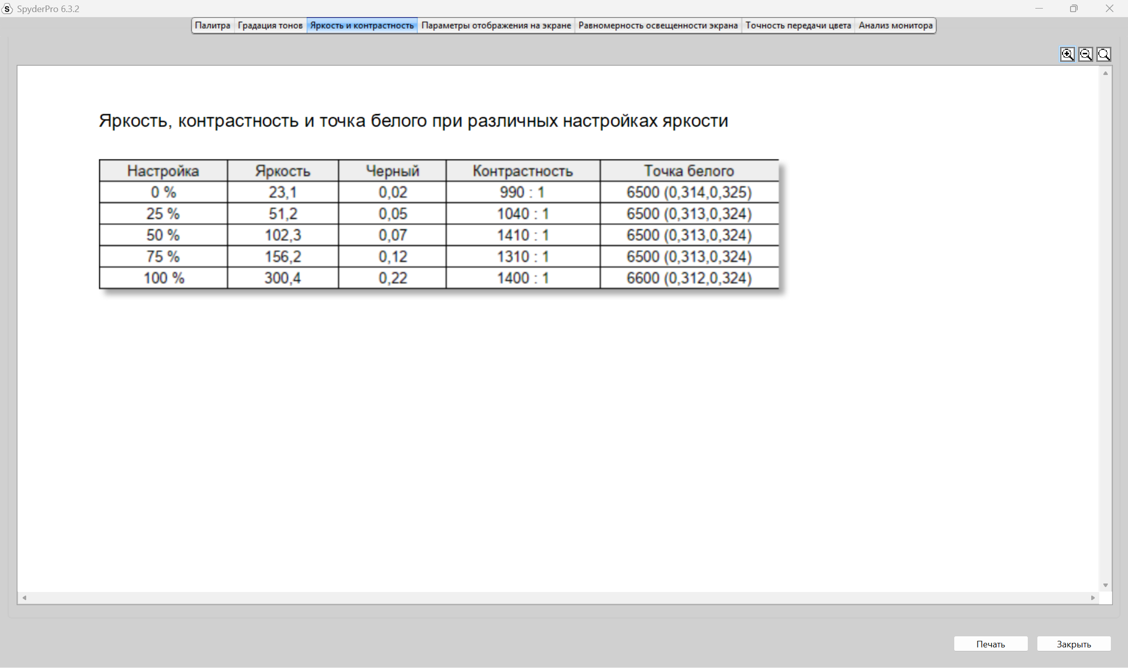 Теперь пришел черед получения оценок качества дисплея от прибора Datacolor Spyder Pro. Как сказал выше, оценивание происходит по стандартам ANSI. Полученные результаты будут в большей степени соответствовать заявленным характеристикам. В отличие от профессионалов в оценивании качества экранов на глаз и без специальных приборов, я не могу сходу сказать, какие засветы по углам, как меняется яркость в зависимости от подсветки, как хорошо передаются цвета и, тем более, я не могу сходу, посмотрев на картинки с монитора, заявить о его уровне охвата разных цветовых диапазонов, как sRGB, DCI-P3 и других, а тем более говорить о качестве и скорости перехода от темных к светлым оттенкам цветов, что отрисовается гаммо-кривой. Я, к сожалению, не такой профессионал, как другие, поэтому использую инструмент и вижу, что sRGB покрывается полностью, AdobeRGB и P3 на 76% каждый, NTSC на 70%. Характеристика от продавца о 100% покрытии sRGB подтвердилась.