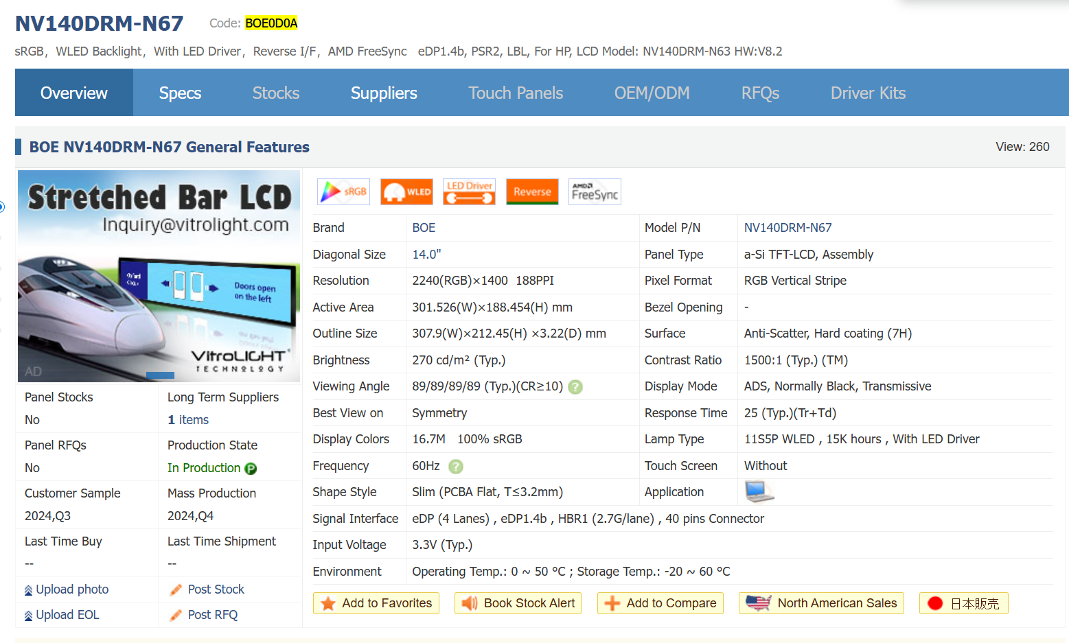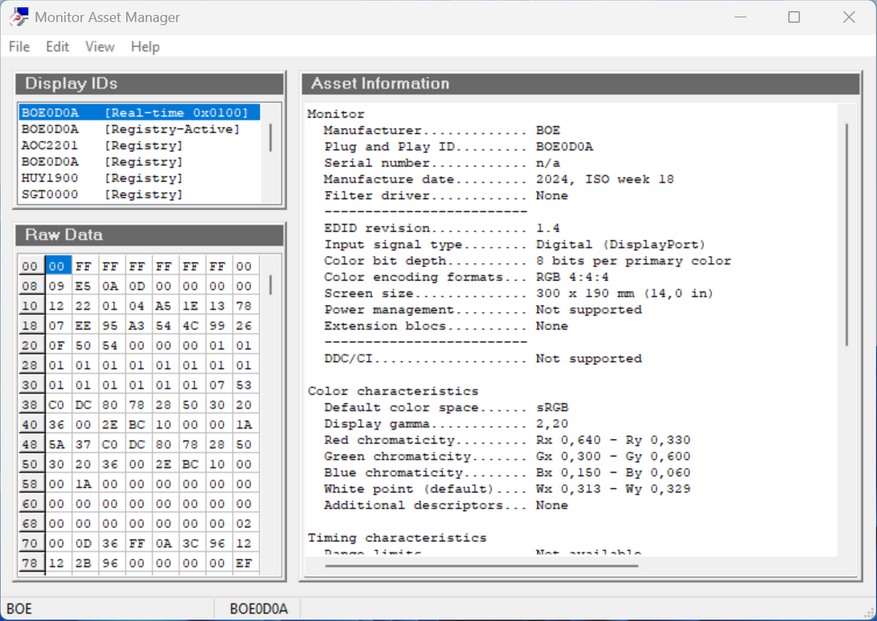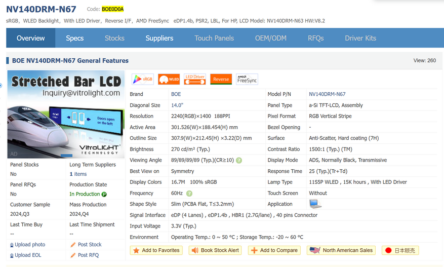 По информации из программы MonInfo, видно, что наименование матрицы BOE0D0A. С сайта panelook.com она выглядит практически такой, как и заявлено в характеристиках. Далее проверю их с помощью прибора и покажу результаты.