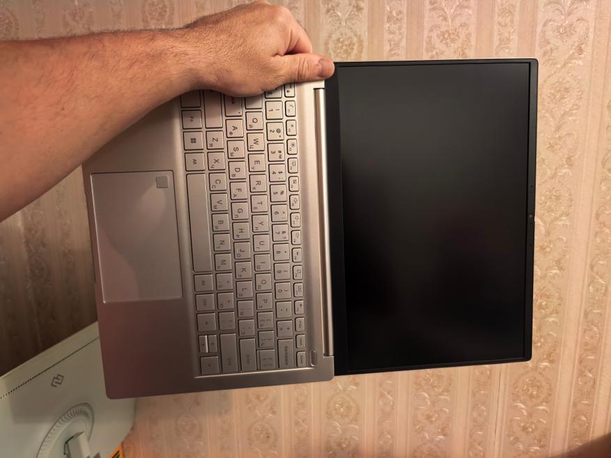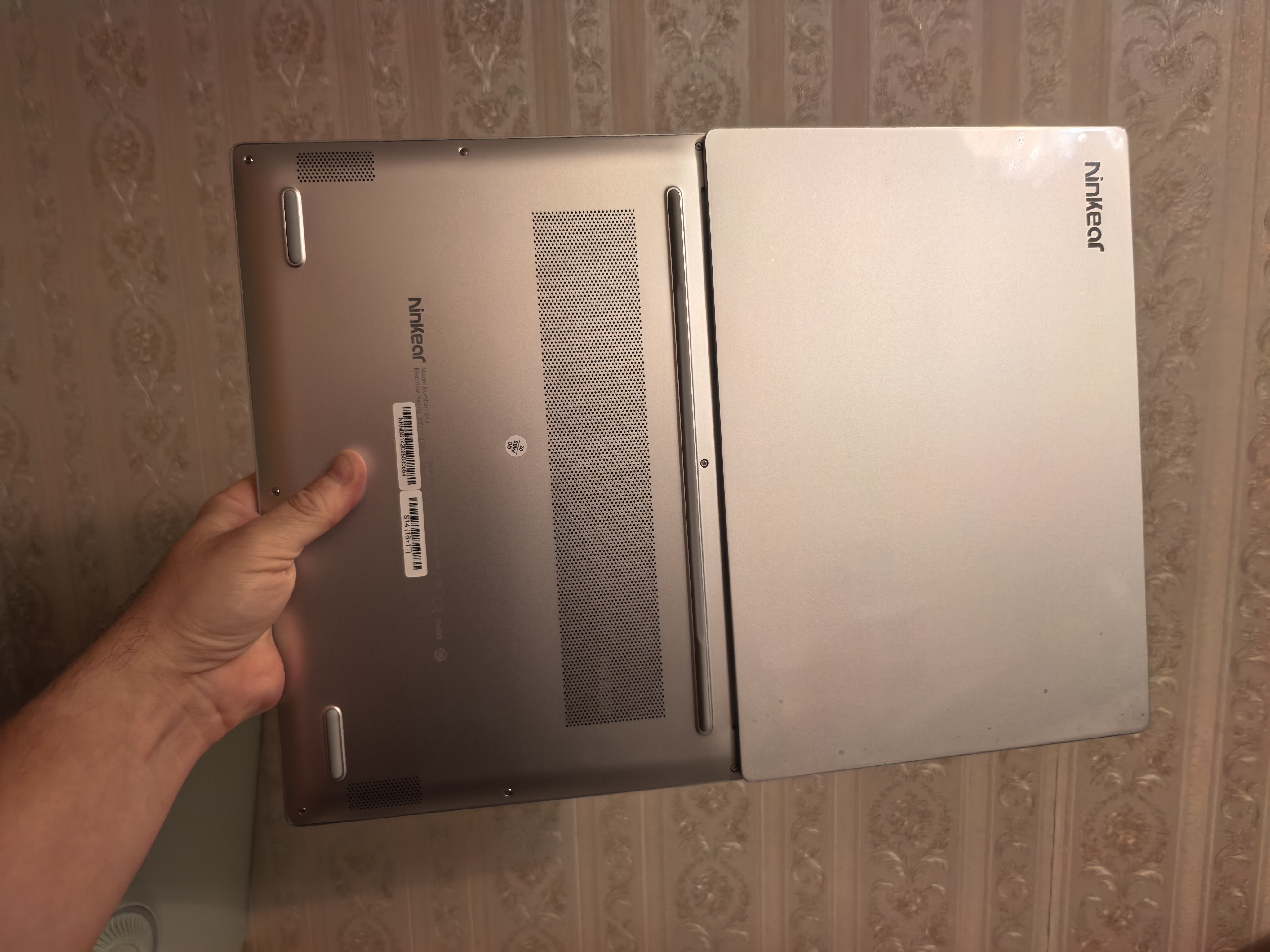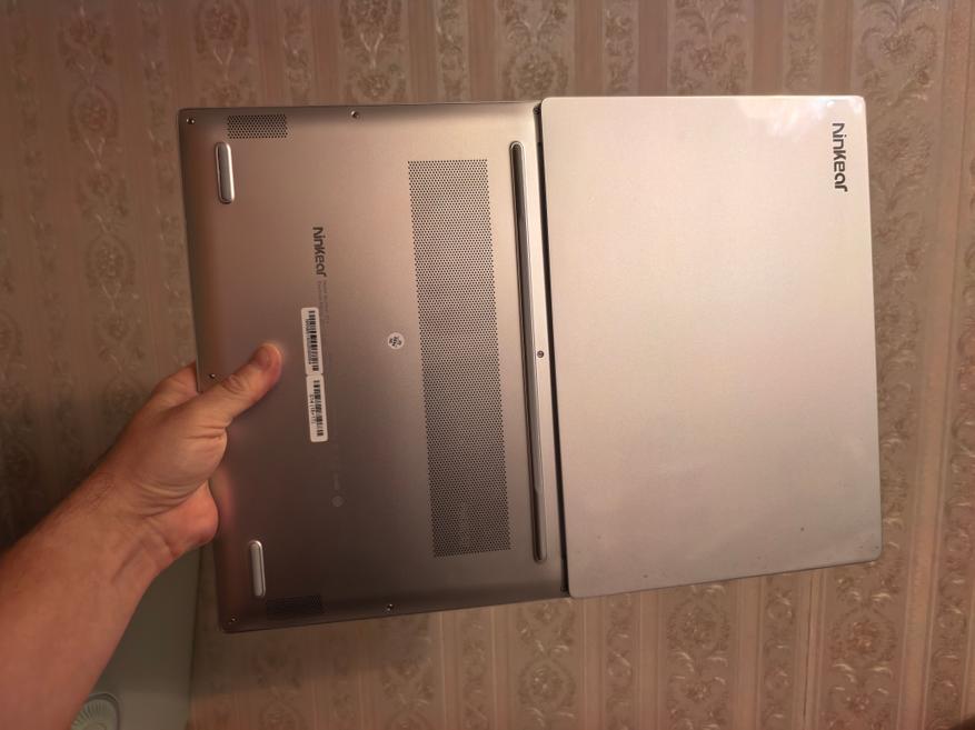 Экран раскрывается на 180⁰. На фотографиях это показано. Первое, что ощущаешь, когда берешь S14 в руки, это его небольшой вес. У меня сразу всплыли воспоминания о HUAWEI MateBook X Pro (обзор здесь), вес которого равен 980 г. Ninkear S14 примерно на 120 г тяжелее, но все равно ощущается очень легко. MateBook X Pro я не стал разбирать, но с S14 все проще. По разборке видно, где сэкономили вес: на креплениях динамиков и дополнительных слотах памяти, как распаянной оперативной. Оперативная память распаяна у S14, увеличить ее нельзя, как и SSD нельзя поставить второй, а можно только заменить на большей емкости.