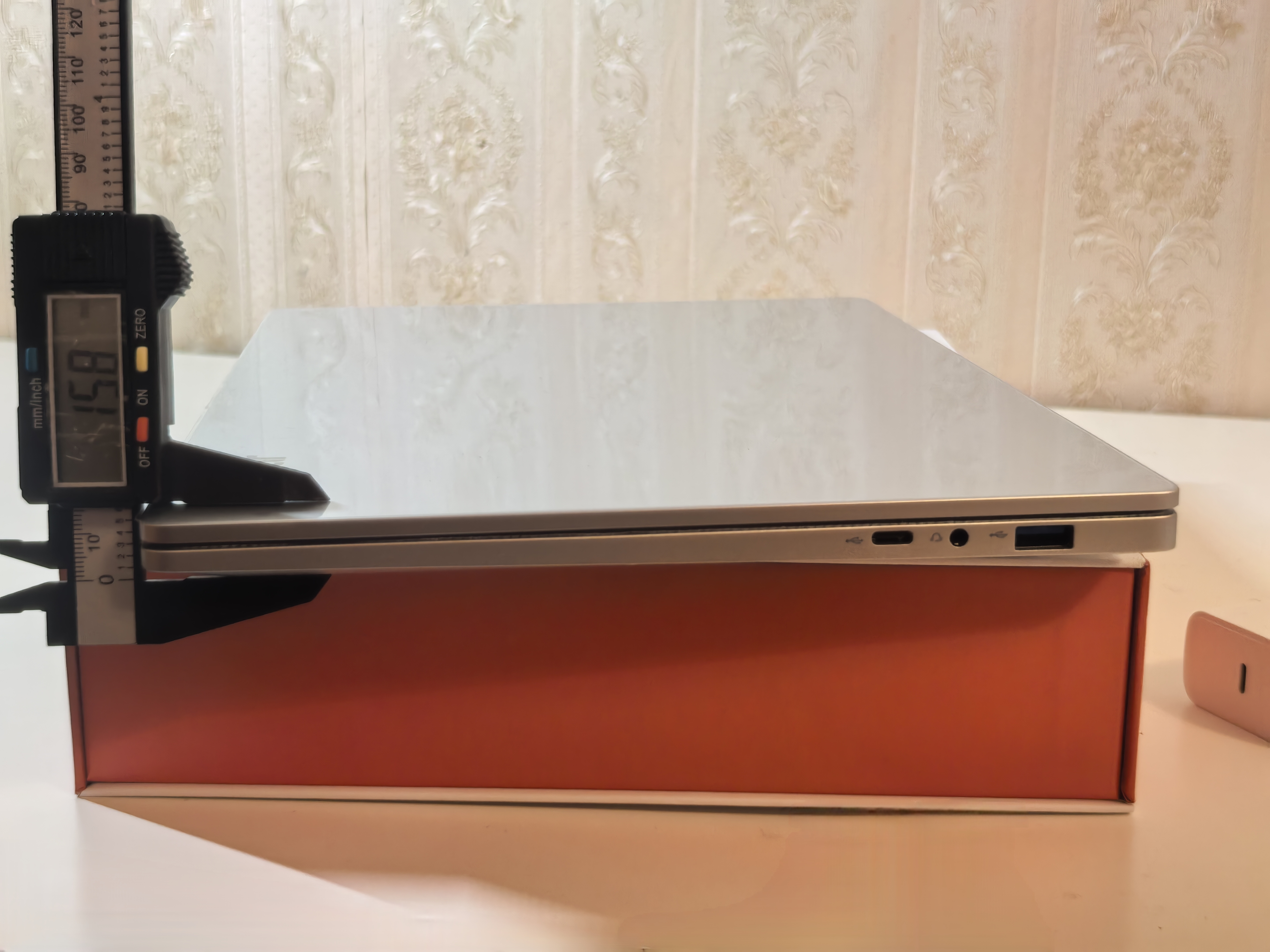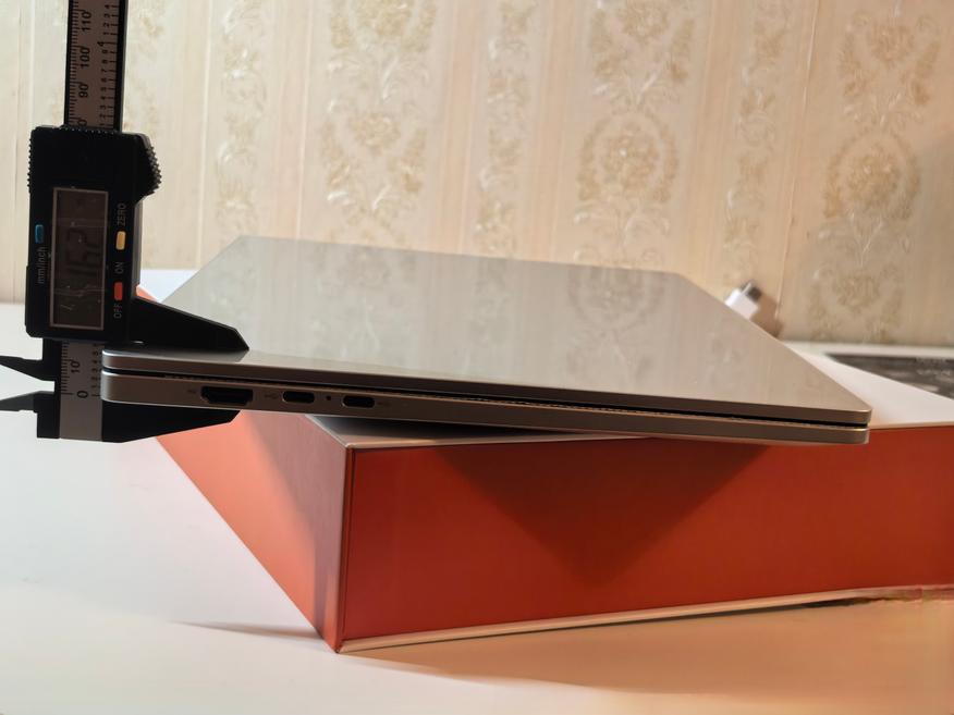 У меня получилась высота в 16,2 и 15,8 мм с обоих концов корпуса ноутбука Ninkear S14. Перевеса по сторонам я не почувствовал. Можно сказать, что развесовка сбалансирована. Портов немного: два полнофункциональных USB-C 3.2 Gen2, один USB-C 2.0 и один USB-A 3.0, HDMI 1.4 и 3,5 мм для наушников. Кому не хватит разъемов, надо подключать хаб. Вес и позиционирование ноутбука предполагает, что выходов будет не много. Мне хватает. Надеюсь, таких пользователей, как я, тоже немало.