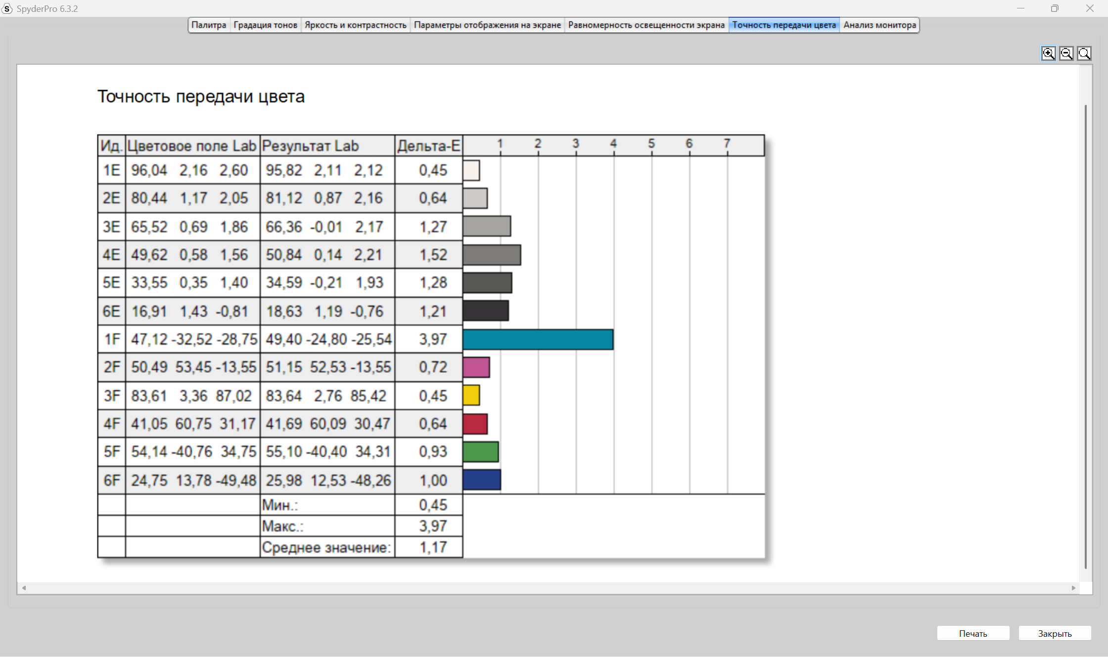 Итог по отклонение ∆E цветов показан в таблице ниже. Среднее значение вполне нормальное 1,17, но минимальное и максимальное значения сильно отличаются друг от друга, 045 и 3,97. Самое большое отклонение по синему оттенку 1F в 3,97, минимальное по белому E в 0,45.