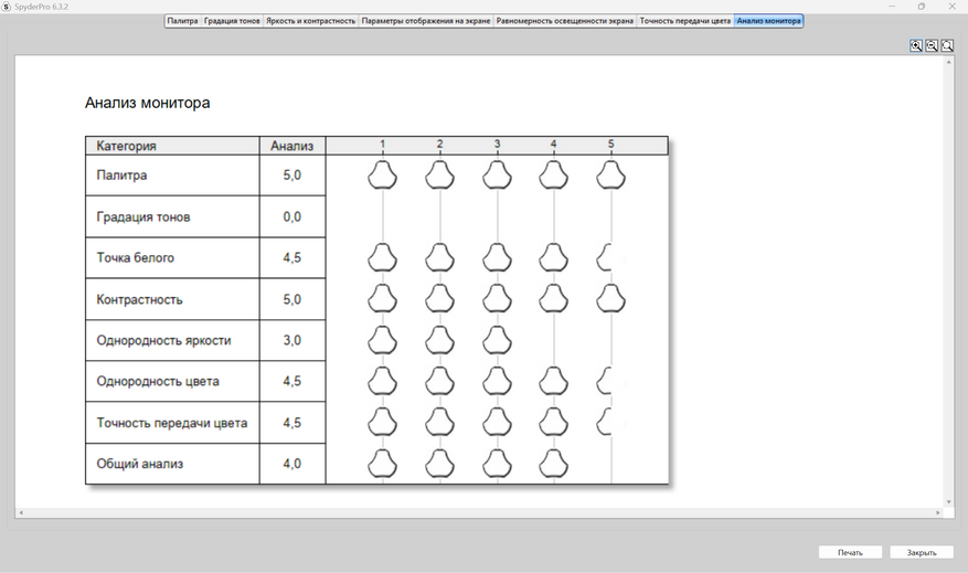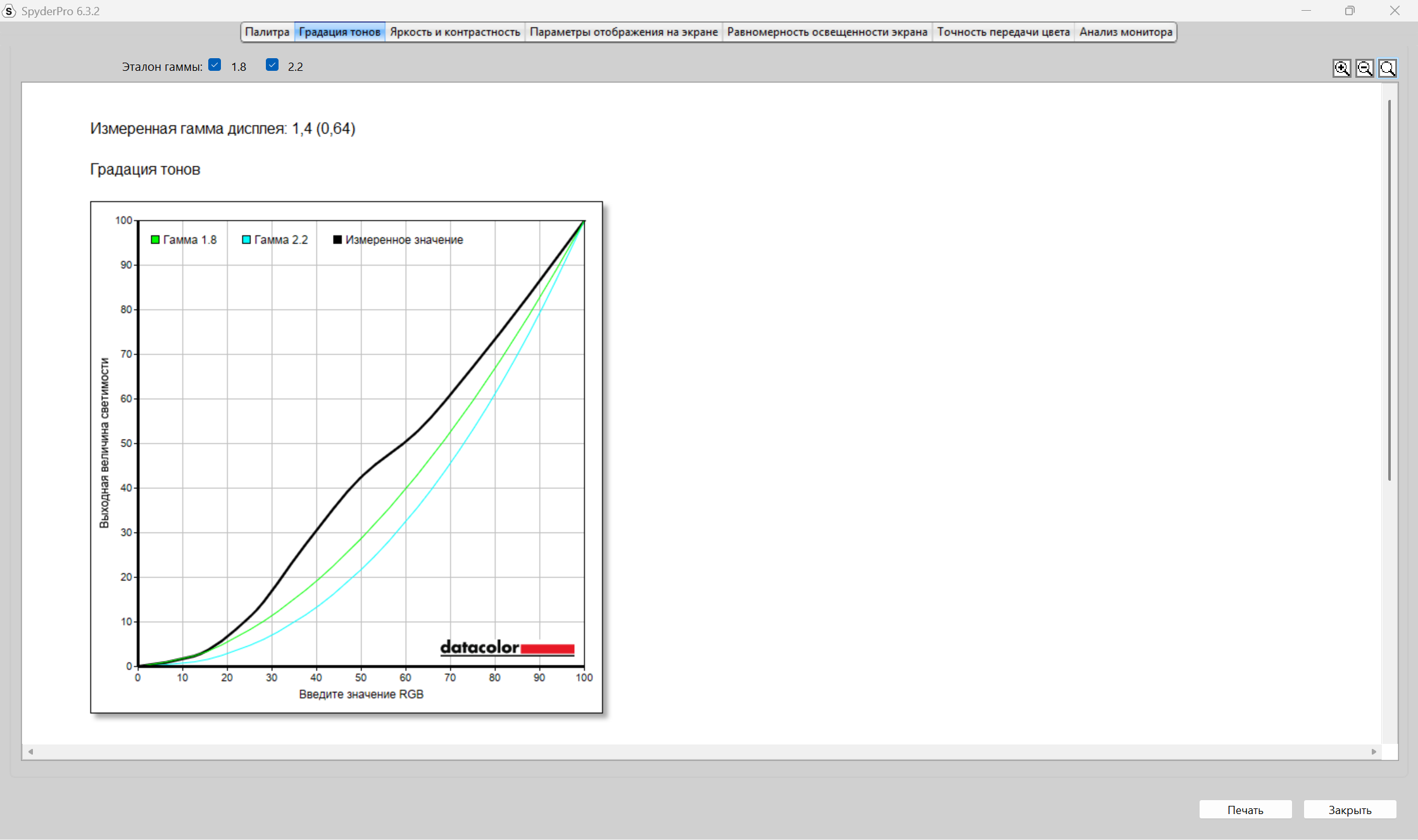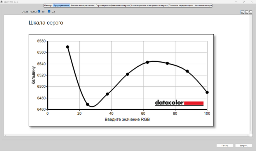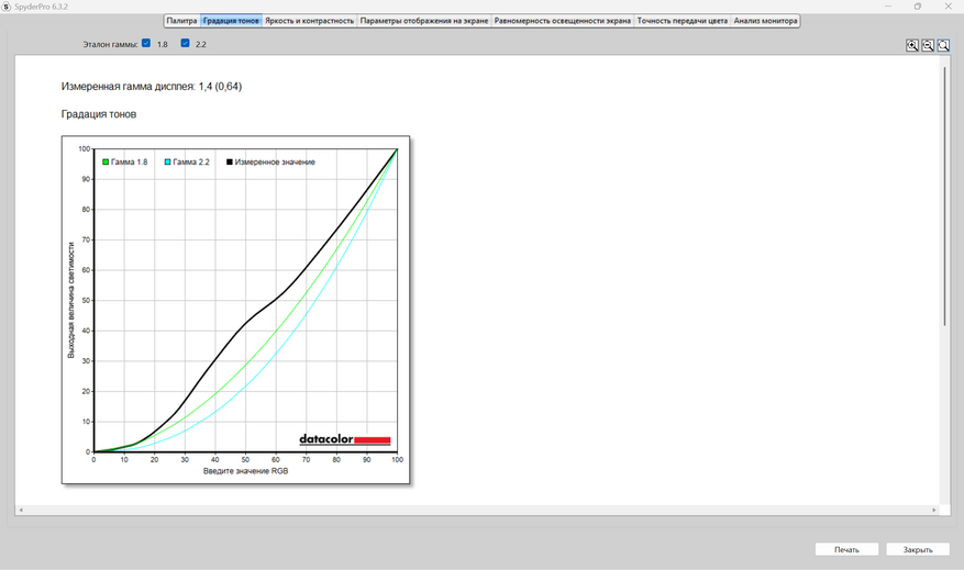 Оцененная гамма прибором оказалась далека от значений 2,2 и 1,8. По Spyder Pro, она равняется 1,4,