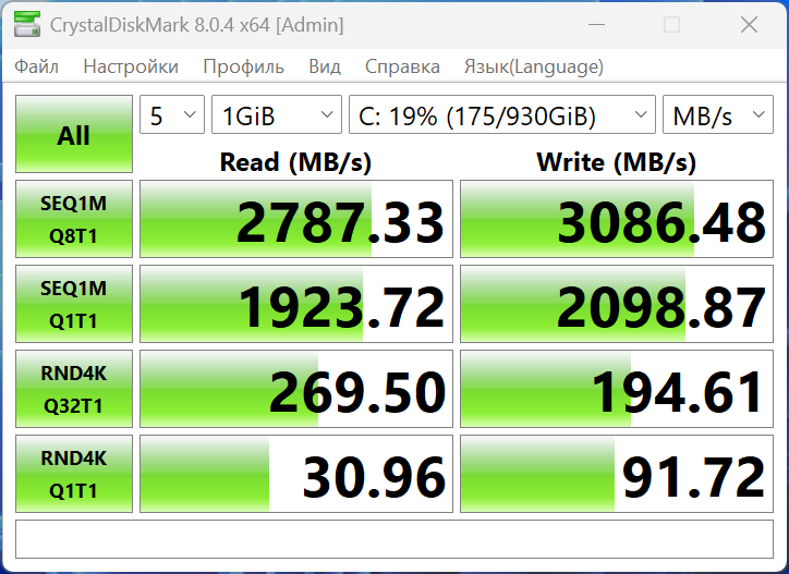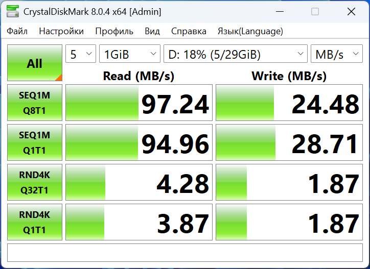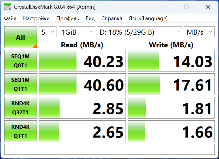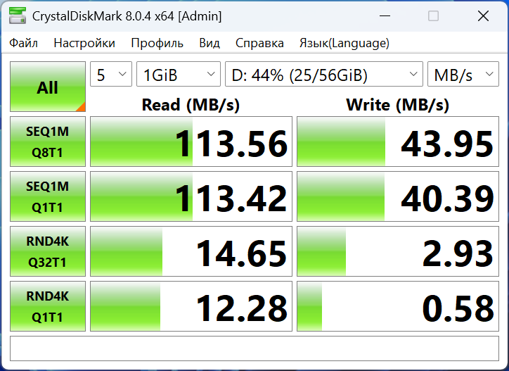 В этом разделе показал результаты теста скорости диска и выходов. У SSD скорость чтения и записи составляет около 3000 МБ/с. У скоростных полнофункциональных USB-C 3.2 Gen2 у меня получилось выжать от такой же поддерживаемой флешки UFSD от Orico небольшую скорость, около 100 МБ/с на чтение и 30 МБ/с на запись. У порта USB-C с другого бока, который используется только для данных, результат получился скромным 40/15 МБ/с, соответственно. Самая большая скорость у меня получилась по USB-A — 114/44 МБ/с.
