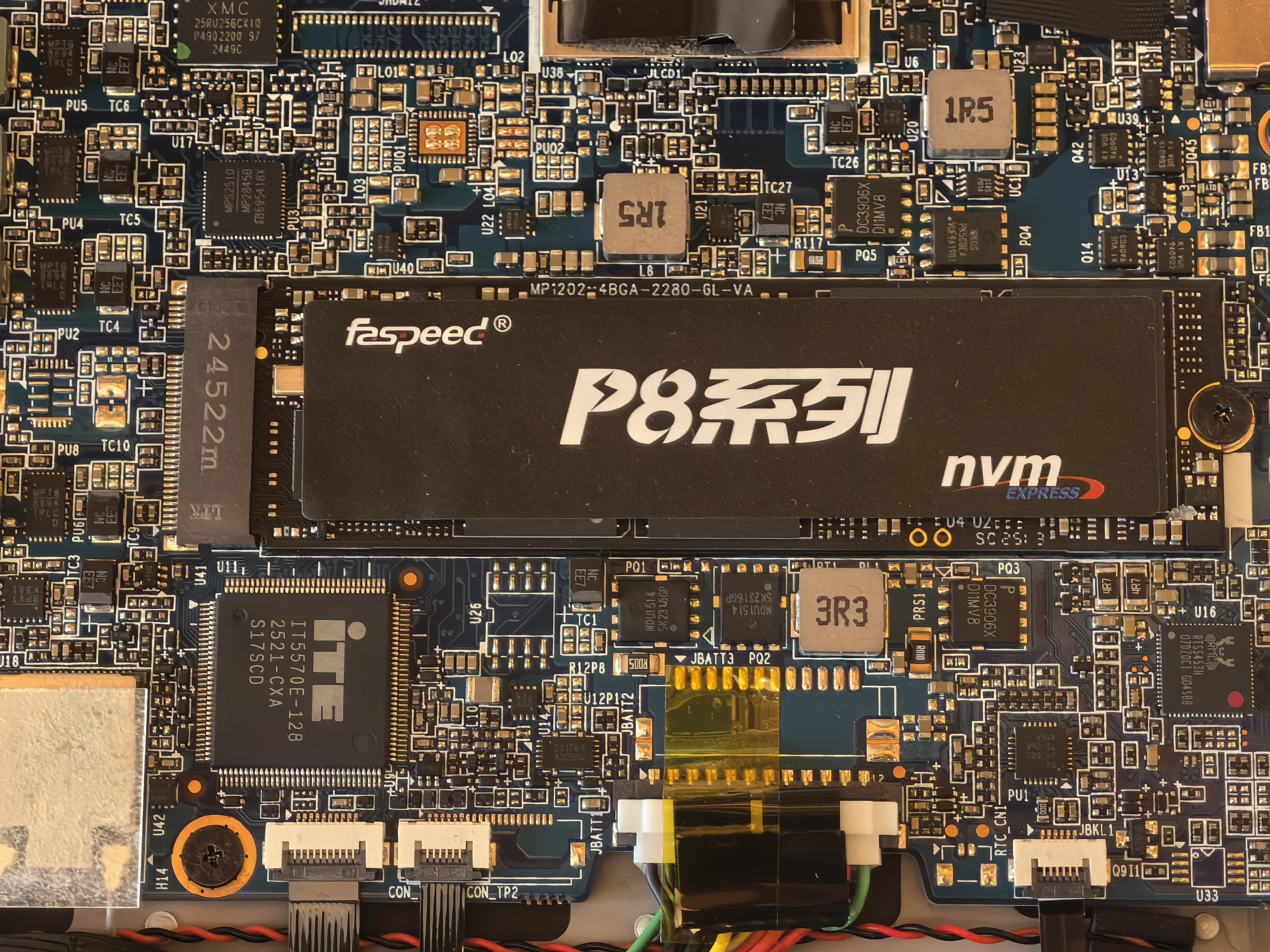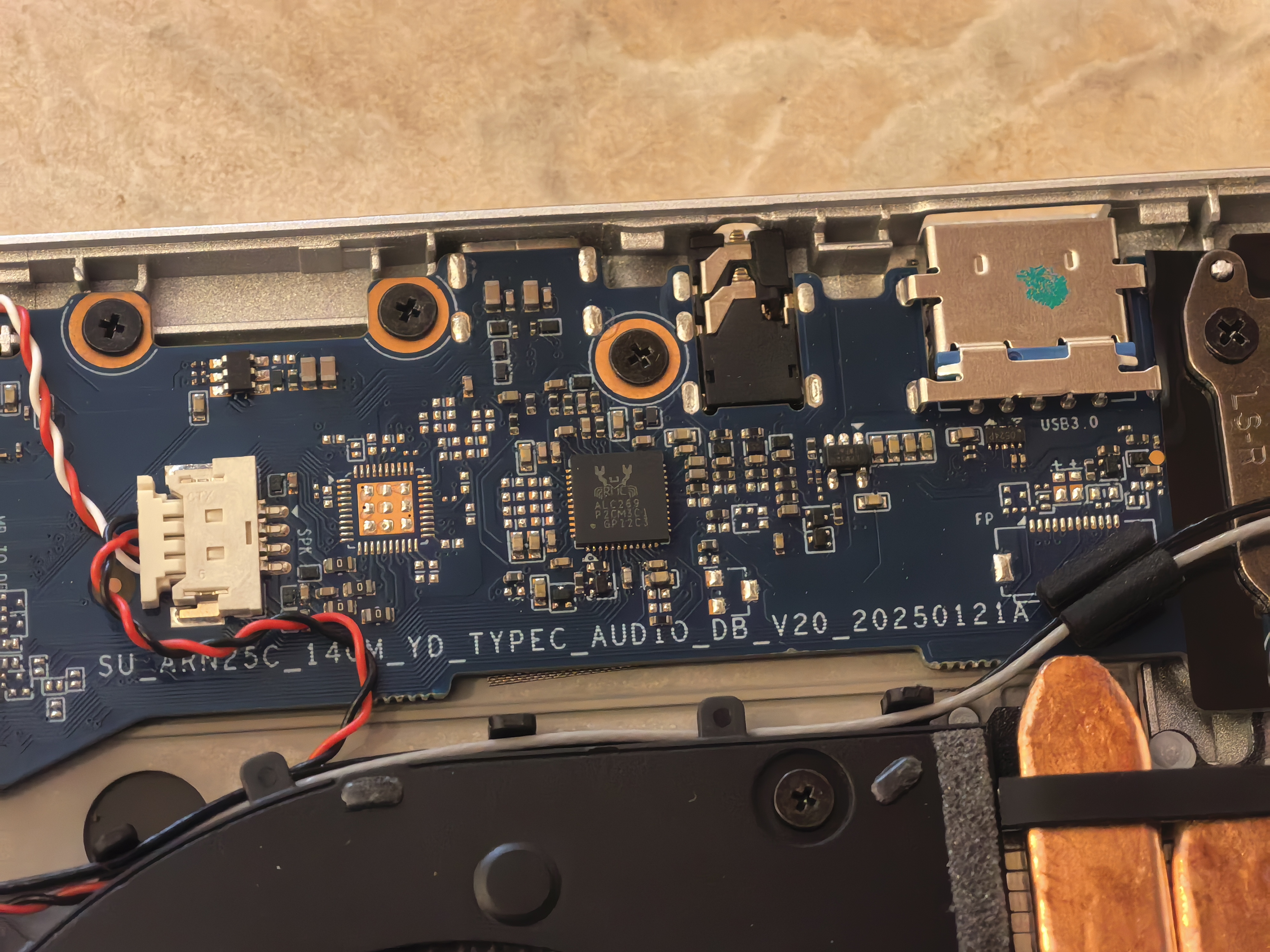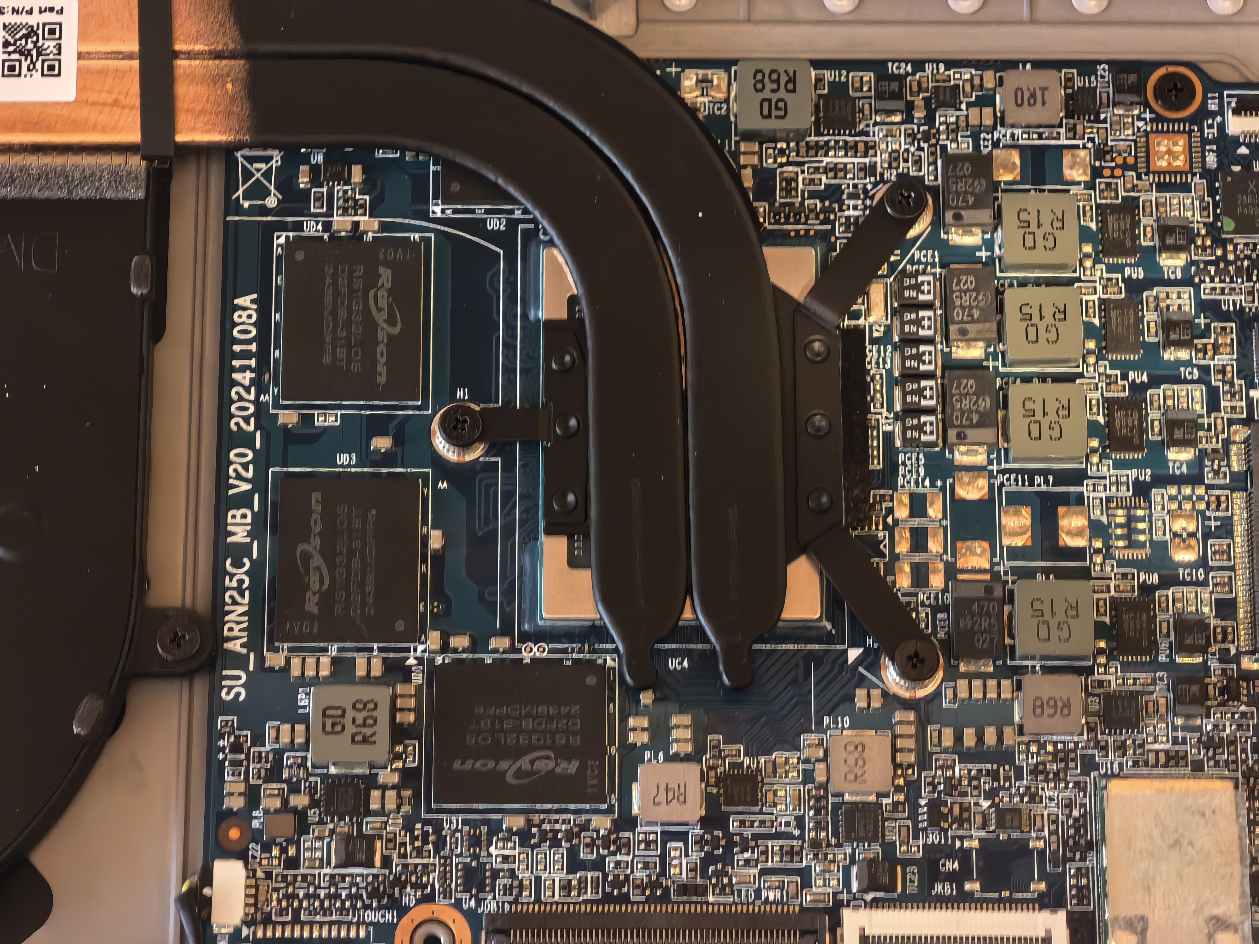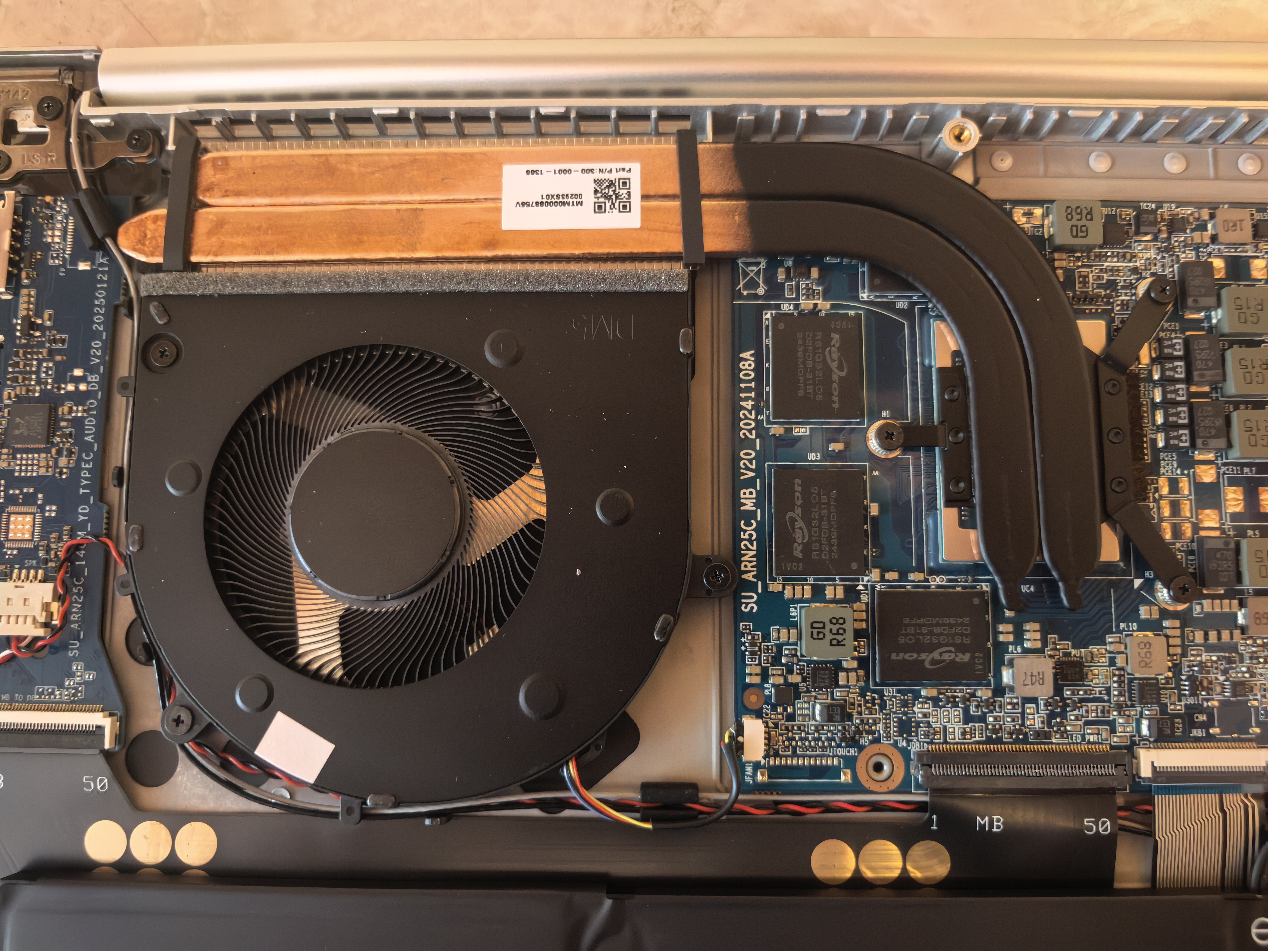 На следующих фотографиях показал укрупненно SSD-диск и распаянную ОЗУ с трубками отвода тепла от процессора. На третьей и четвертой фотографиях виден кулер с тонкими лопастями и аудиоконтроллер от RealTek.