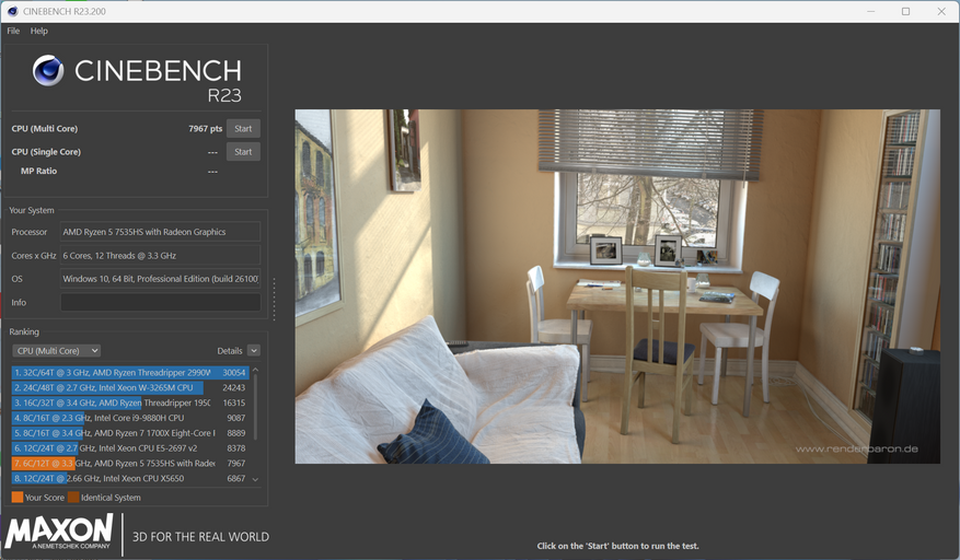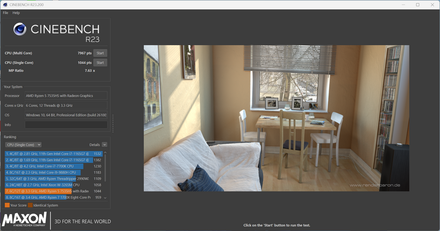 В многоядерном тесте Cinebench результат 7967 баллов, в одноядерном — 1044 балла.