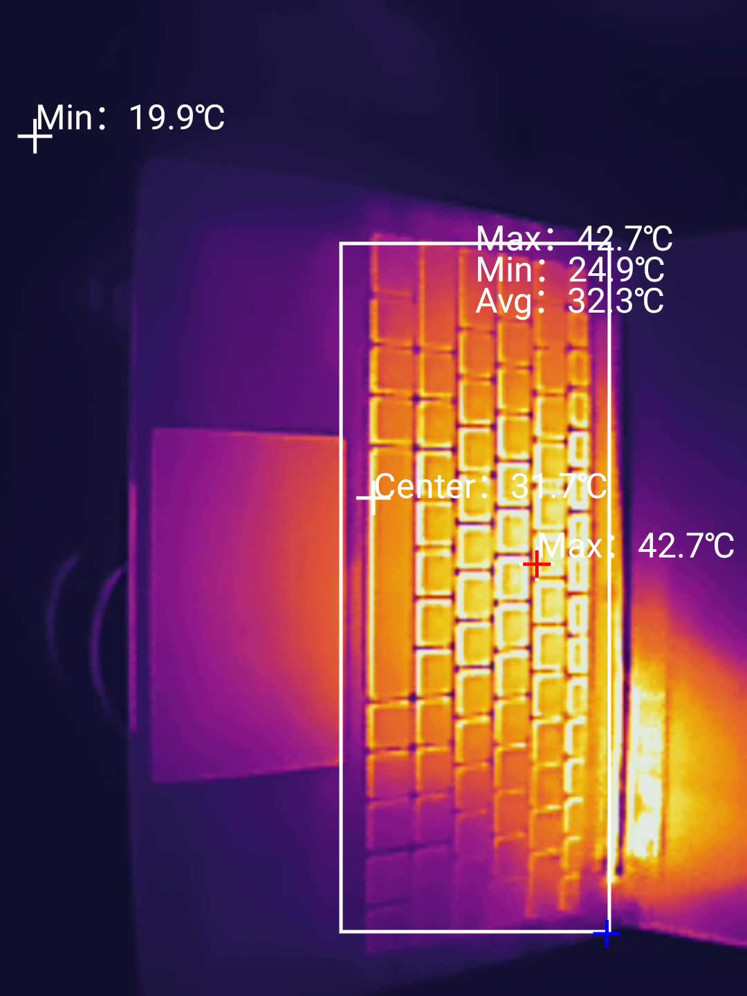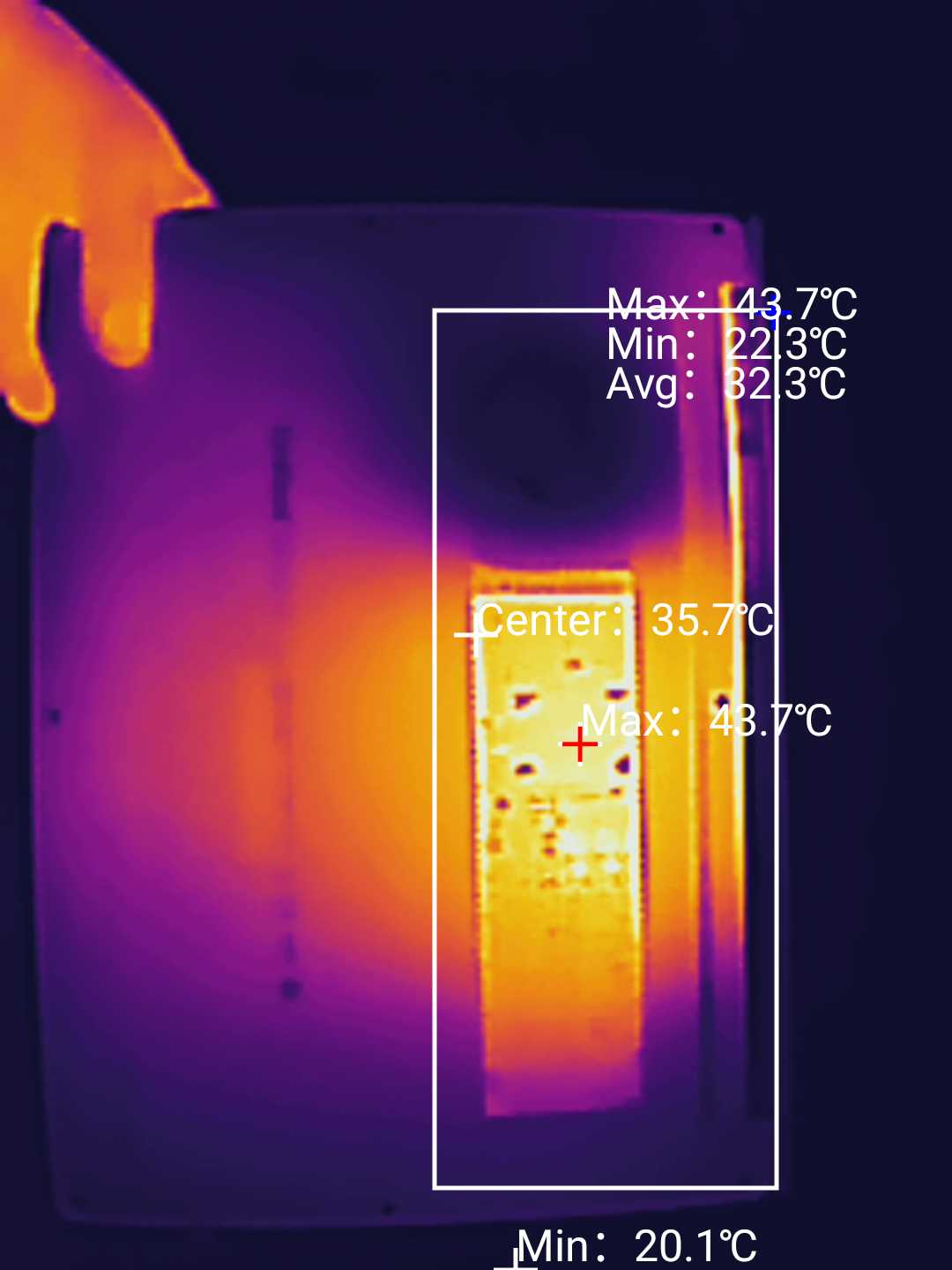 По результатам теста HeavyLoad выше максимальный нагрев составил 43-44⁰С с обеих сторон.
