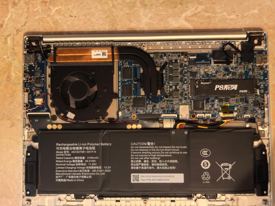 Вид на снятую крышку показал на следующей фотографии. Аккумулятор занимает примерно 40% площади. Кулер с теплоотводными трубками еще примерно 15%. Одного большого кулера для охлаждения компактного ноутбука более чем достаточно. Все остальное отведено под плату и микросхемы. Оперативная память распаяна. SSD диск от «любимого» бренда Ninkear (часто именно такие устанавливаются в его ноутбуки) faspeed. По углам стоят два динамика. Видно, они удерживаются за счет пластмассовых палок. Шурупы не стали использовать специально для экономии веса. Звук у ноутбука не супер, он не совсем плохой, но для лучшего эффекта советую подключить колонки.