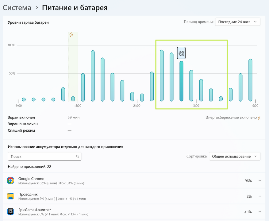 Отдельно провел тест просмотра YouTube на 50% яркости в разрешении 1440р. Время работы сервиса составило 6 ч. Для тонкого и легкого ноутбука на неурезанном процессоре (не серия «U» у Ryzen) это неплохой показатель. Как минимум 2 фильма посмотреть хватит, а то и все три. Переводя полученный результат в офисные задачи, на день емкость полностью заряженного ноутбука хватит без проблем.