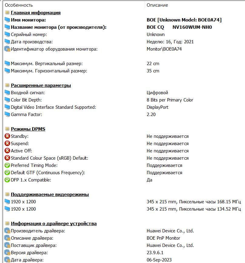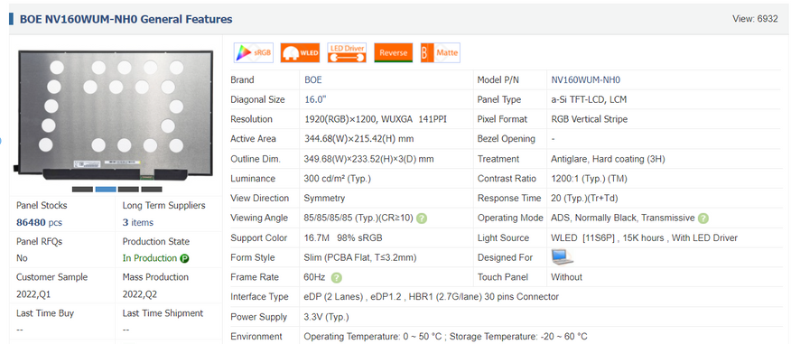 Информация по системе и дисплею показал на следующих скриншотах. Из программы AIDA64 взял информацию о производителе матрицы ноутбука. На сайте panelook.com нашел и представил на третьем скриншоте по ней информацию. Матрица от 2022, с разрешением 1920х1200, поддерживает 16,7 млн. цветов, имеет 98% охвата sRGB, частоту обновления в 60Гц, производится компанией BOE.