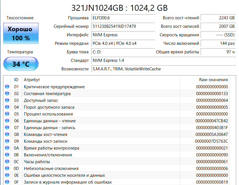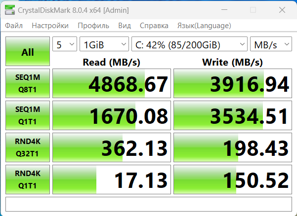 Твердотельный накопитель разделен на два диска. Скорость чтения/записи находится на уровне 4800 и 3900 МБ/с, соответственно.