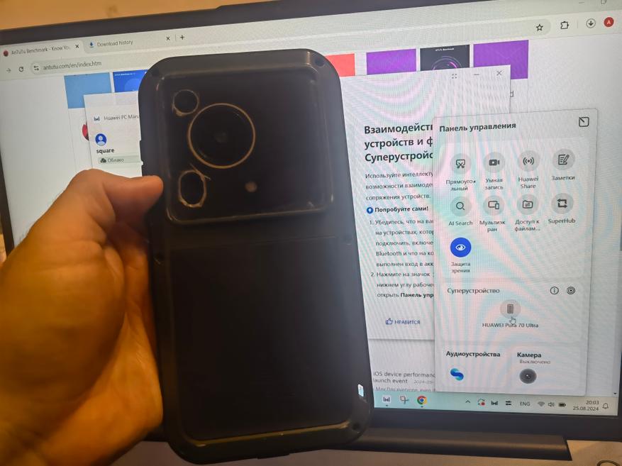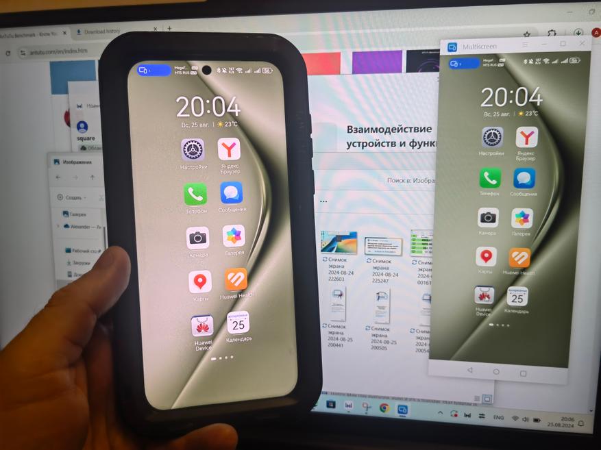 На следующих фотографиях показал, что система D16 видит смартфон. После соединения его экран полностью отображается на ноутбуке и можно мышкой управлять по телефону с экрана MateBook D16.