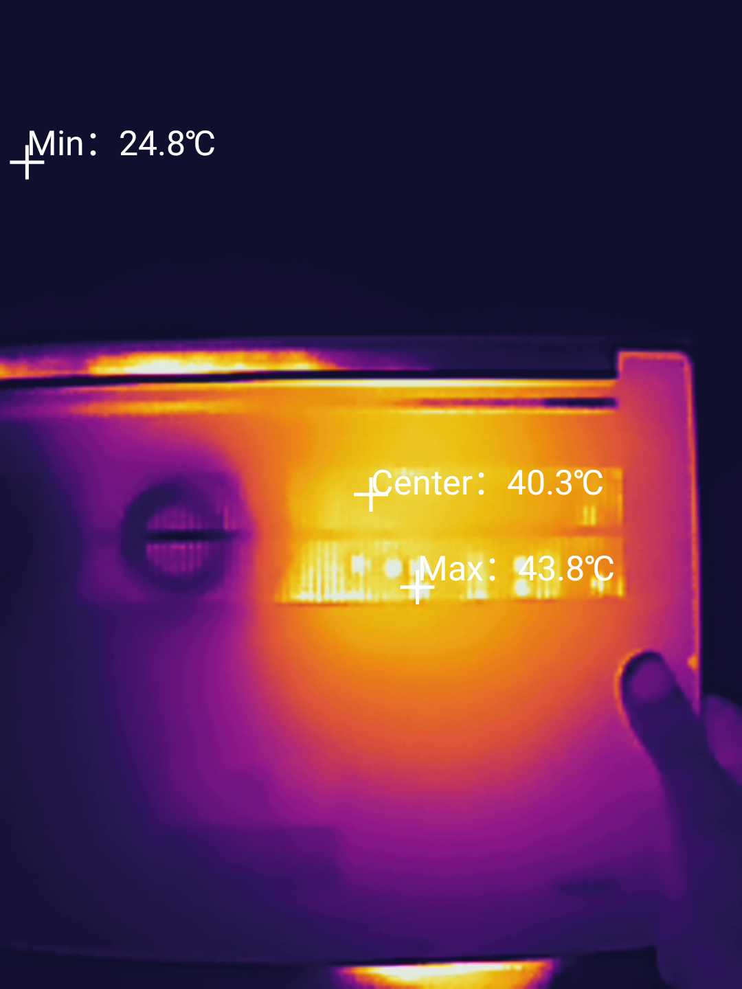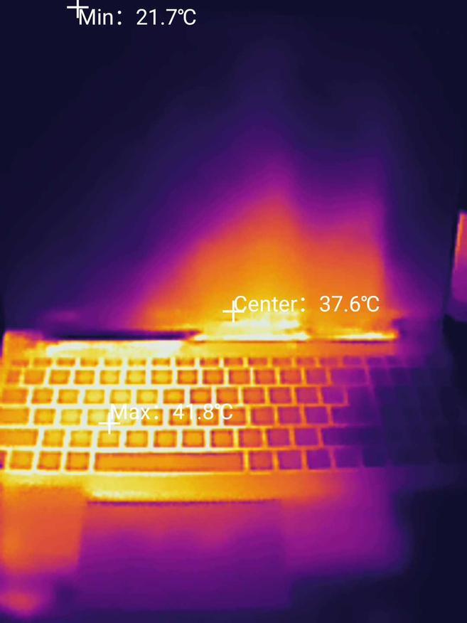 Как сказал выше, работа вентиляторов еле слышна при максимальной нагрузке. Нагрев в самой горячей точке по результатам теста HeavyLoad после тридцати минут работы составил 43,8⁰С. На фотографиях показал, какие части корпуса с двух сторон нагрелись больше всего. Оценил также шум работы двух вентиляторов. Он составил 43 дБ, но их работа напоминала «тихий шепот». Мне это понравилось больше, чем в случае MateBook X Pro 2024, вентилятор которого издавал более громкий звук.