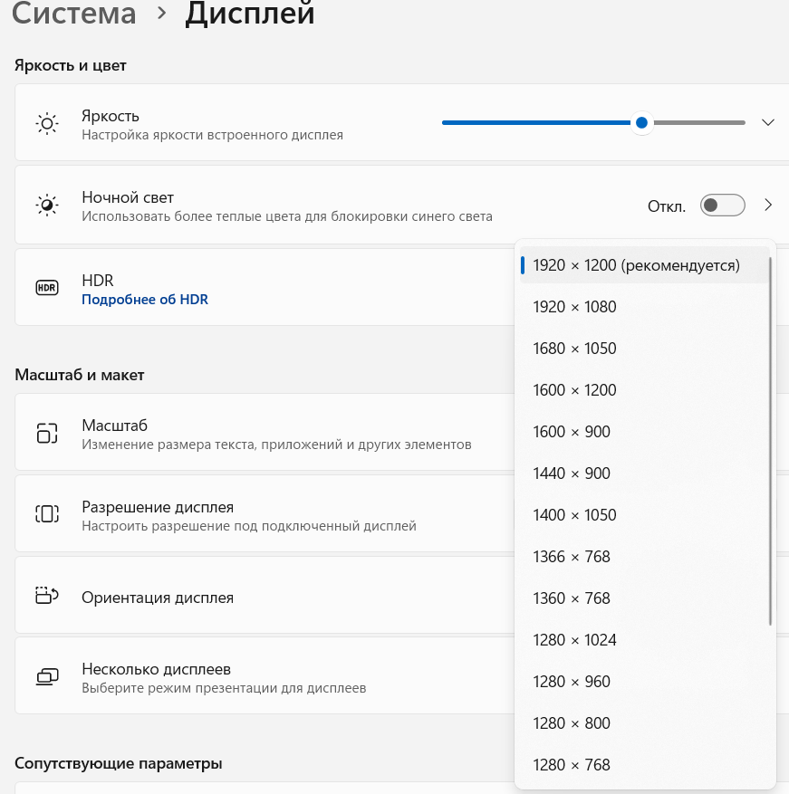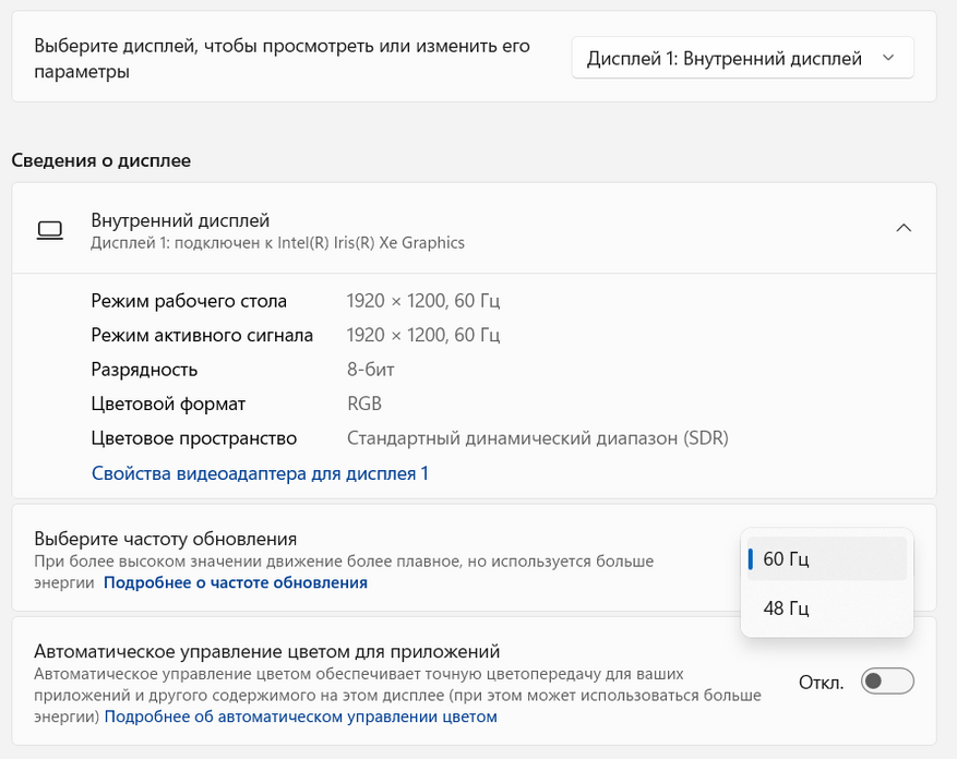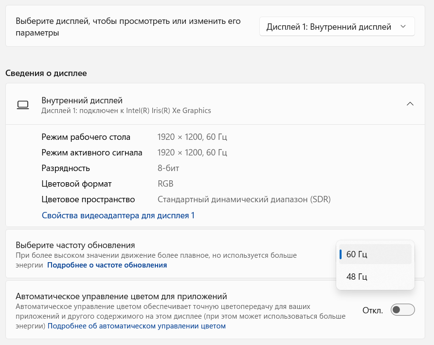 Из характеристик системы видны возможные разрешения. Поддерживается два варианта обновления: или 60Гц, или 48Гц.
