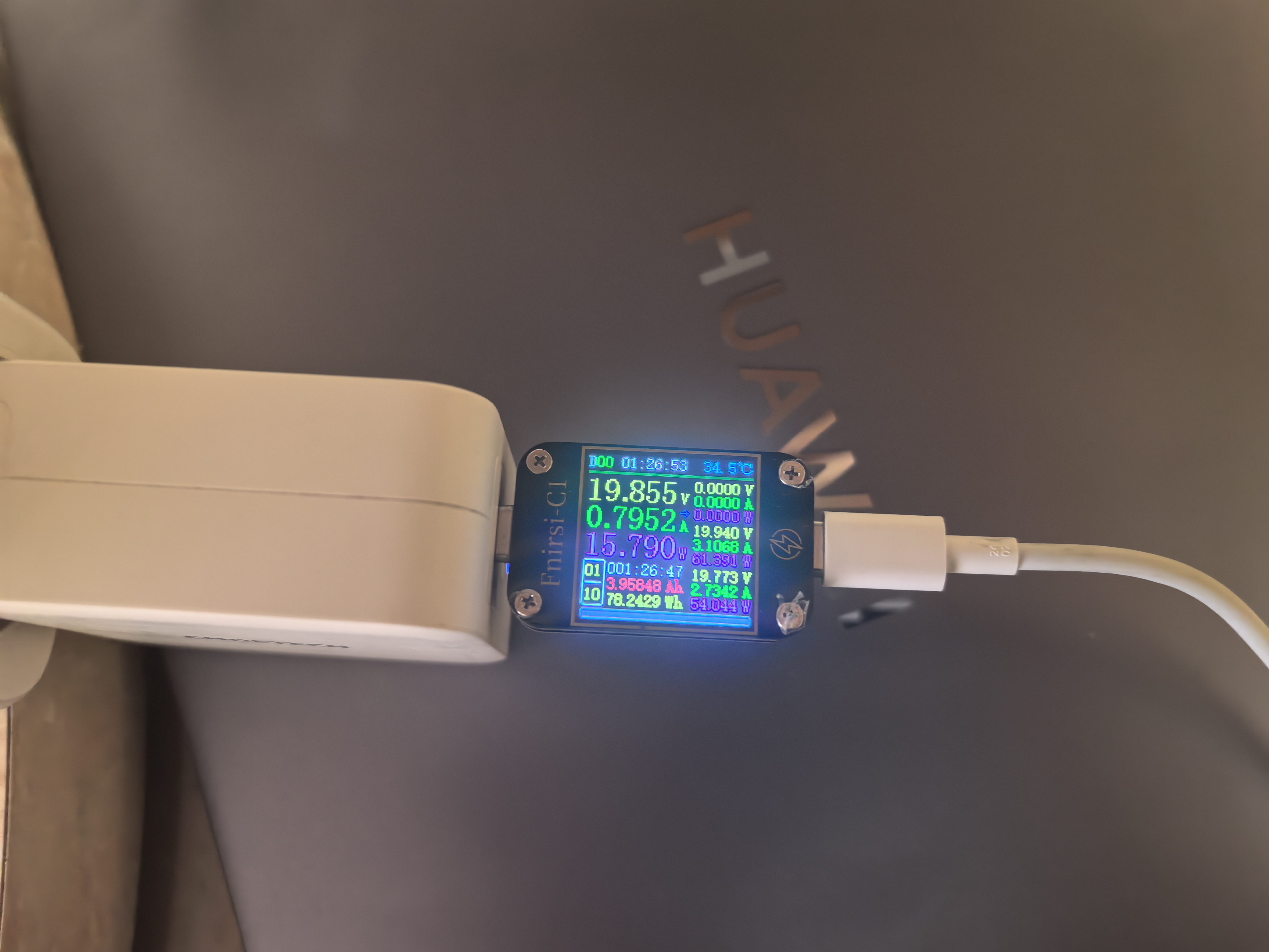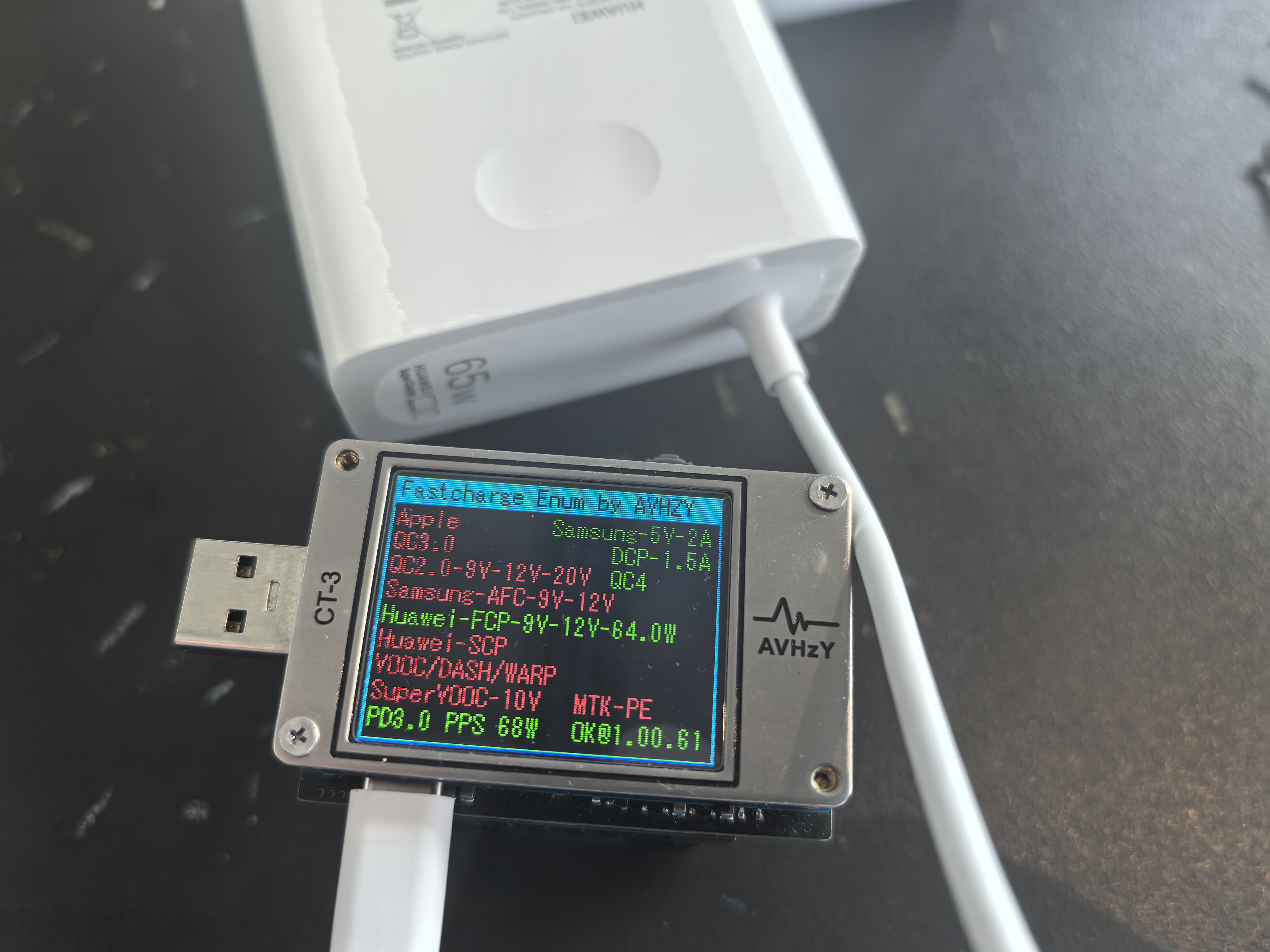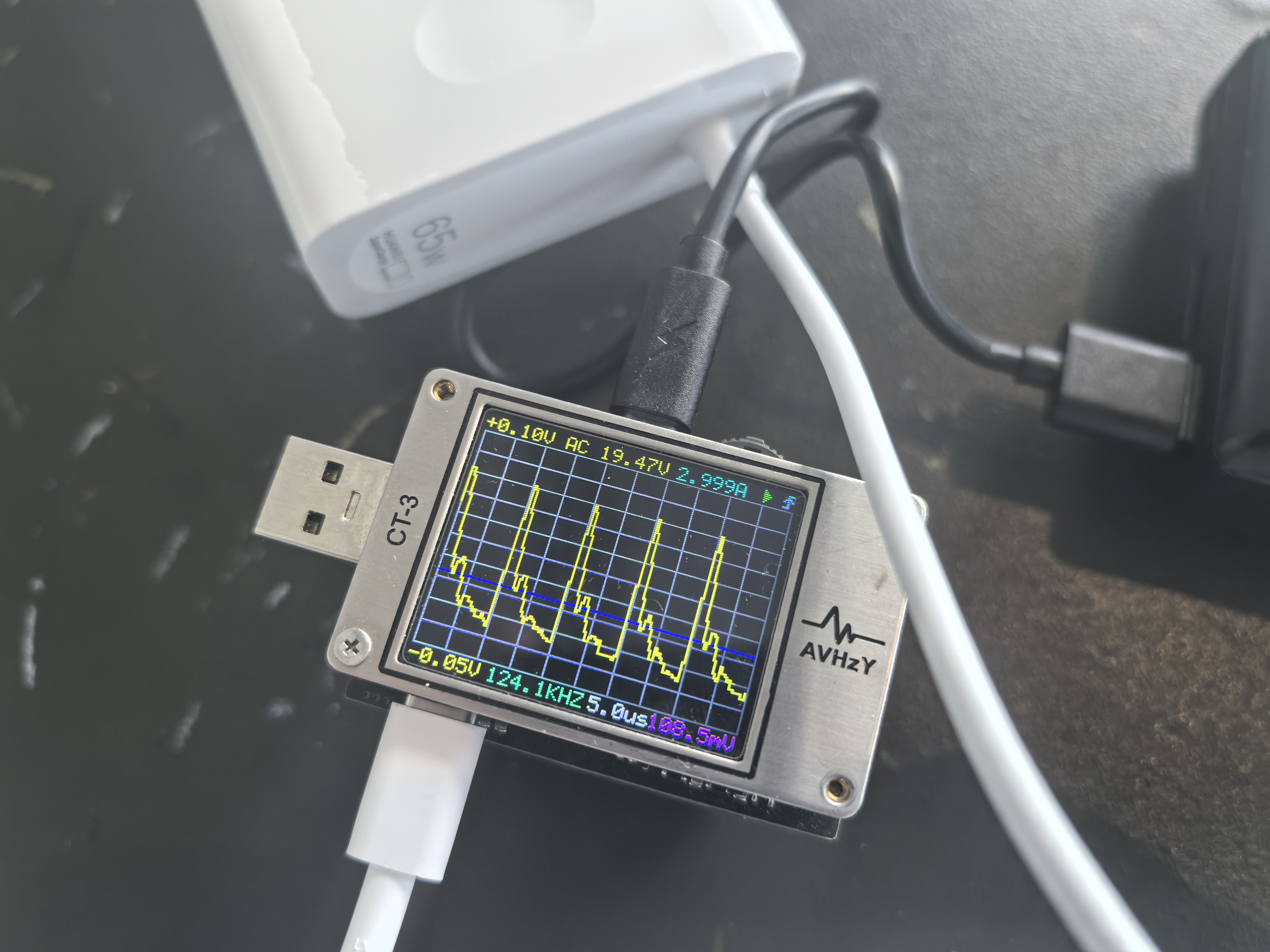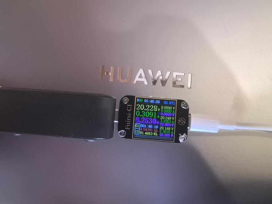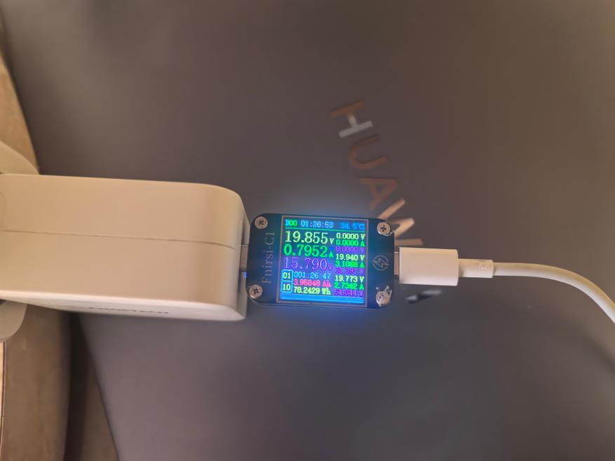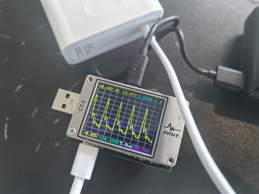 Зарядное устройство в новинке 2024 г. идёт со встроенным кабелем USB-C. Относительно D16 предыдущего года, это не весь «даунгрейд» (ЗУ имело привычный USB-C порт в 2023 г): количество портов уменьшилось. ЗУ поддерживает следующие протоколы и режимы: PD3.0 до 68Вт, Huawei FCP, Samsung 5В/2А, DCP 1,5A, QC4.0. Пульсации на максимальной мощности 20В/3,25A равны 108,5 мВ, что составляет 0,6% от напряжения (пороговым считается отметка в 2%). Такая цифра — оптимальная и очень низкая. Комплектная зарядка хорошего качества. Однако я ей не пользовался из-за не отсоединяемого кабеля, а с низкими пульсациями у меня есть другие зарядные, которые я использую каждый день. Возможно, наступит день, когда в комплекте ноутбуков не будет зарядного, и это будет печально.
