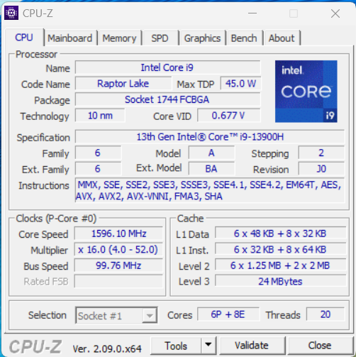 | Процессор: | Intel Core i9-13900H с 6 шт. ядер от 2,6ГГц до 5,4ГГц и 8 шт. ядер от 1,4ГГц до 4,1ГГц (Raptor Lake-H, L3-кэш 24 МБ) |