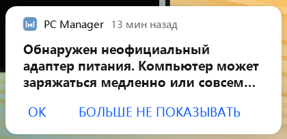 Если контроллеры в повербанке и MateBook D16 сразу не договаривались о режиме взаимодействия, то появлялось сообщение, как показал ниже. Его я заметил только в первый раз при подключении Zime T133LP (обзор здесь). В дальнейшем таких предупреждений о медленном заряде не было (я нажал «ОК», а не «Больше не показывать»).