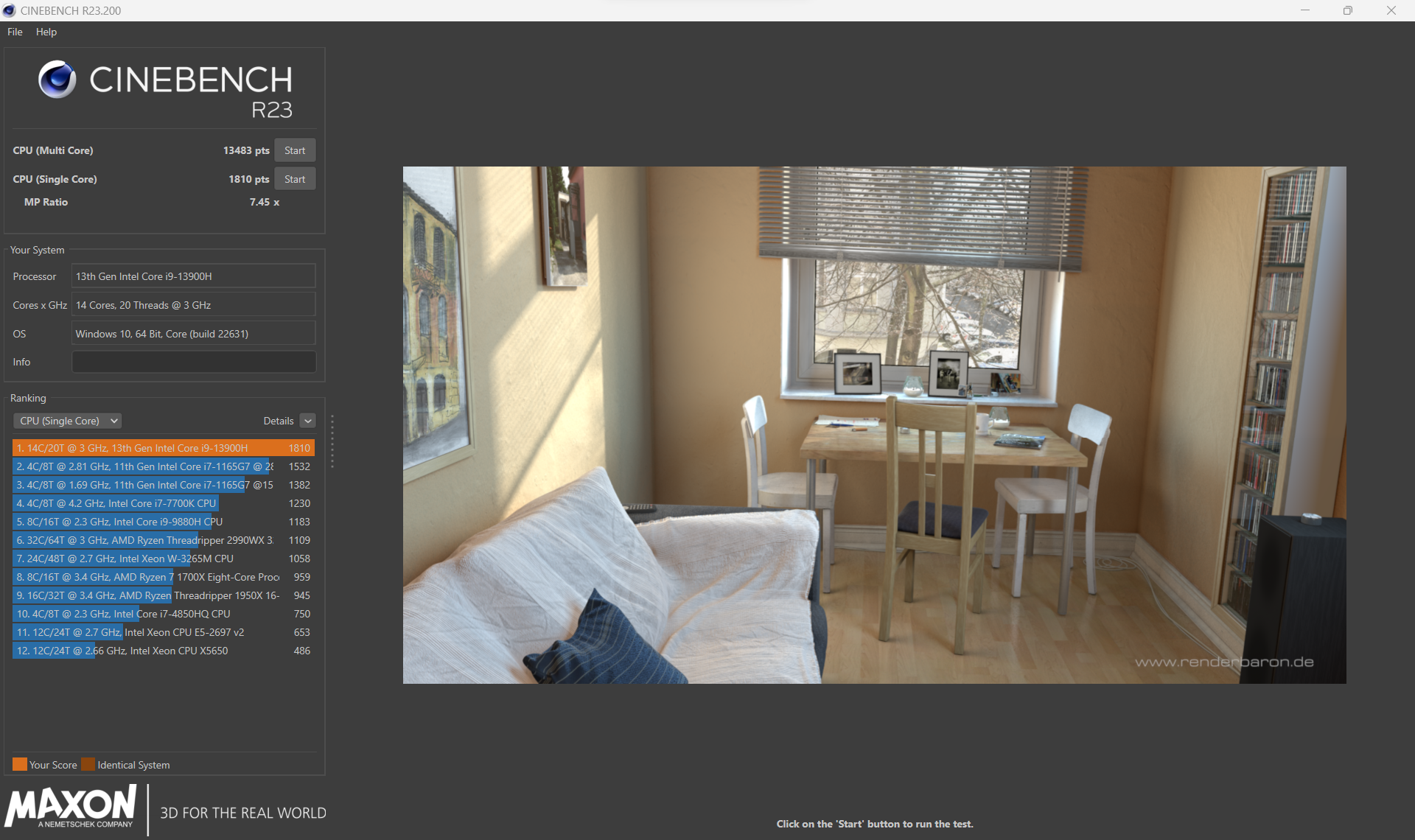 Результаты теста Cinebench показал на следующих фотографиях. Результат для многопоточного режима — 13483 балла, для однопоточного — 1810 баллов.