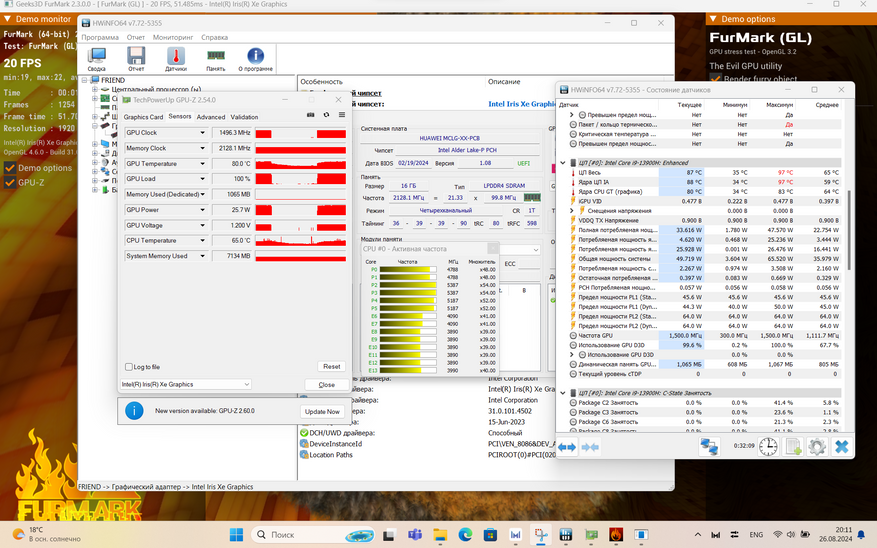 В тесте на максимальную производительность HeavyLoad я практически не слышал работу вентиляторов (в прошлогоднем и позапрошлогоднем ноутбуках их было по одному). В модели 2024 г внутри стоят два вентилятора, которые, как получается у меня, эффективно отводят тепло и их не очень слышно, они не гудят. Максимальная частота кадров под конец теста в 30 мин составила 1695 к/с. Цифра больше, на минимум 50%, чем во флагманском ноутбуке HUAWEI MateBook X Pro 2024.