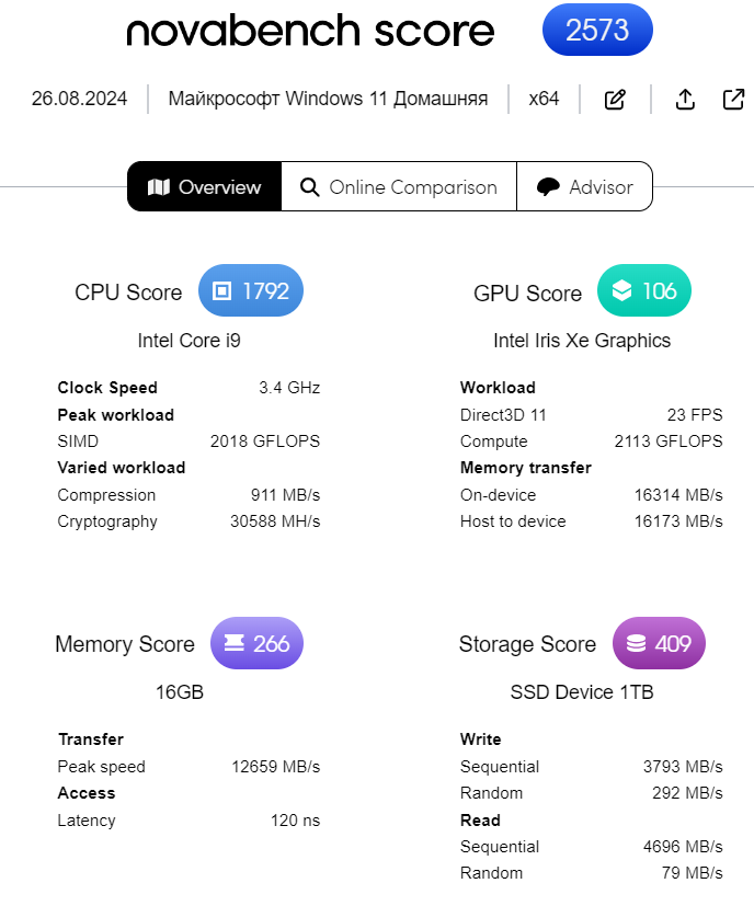 В данном разделе буду сравнивать результаты тестов с ноутбуком Ninkear N14 Pro (обзор здесь) и просто для информации иногда приводить результаты тестов HUAWEI MateBook X Pro 2024. Во всех тестах ноутбук Ninkear N14 Pro набирает меньше баллов, чем обозреваемый D16. Модель N14 Pro работает на процессоре Intel i7-11390H, способного выдавать до 5ГГц в boost-режиме. В MateBook D16 2024 есть модификация тоже на Intel Core i7, но версии 13700H, которая лучше названной у N14 Pro, поэтому для себя отметил, что производительность модификации D16 на процессоре Intel i7 будет выше сравниваемой ноутбука на схожем по наименованию процессоре.