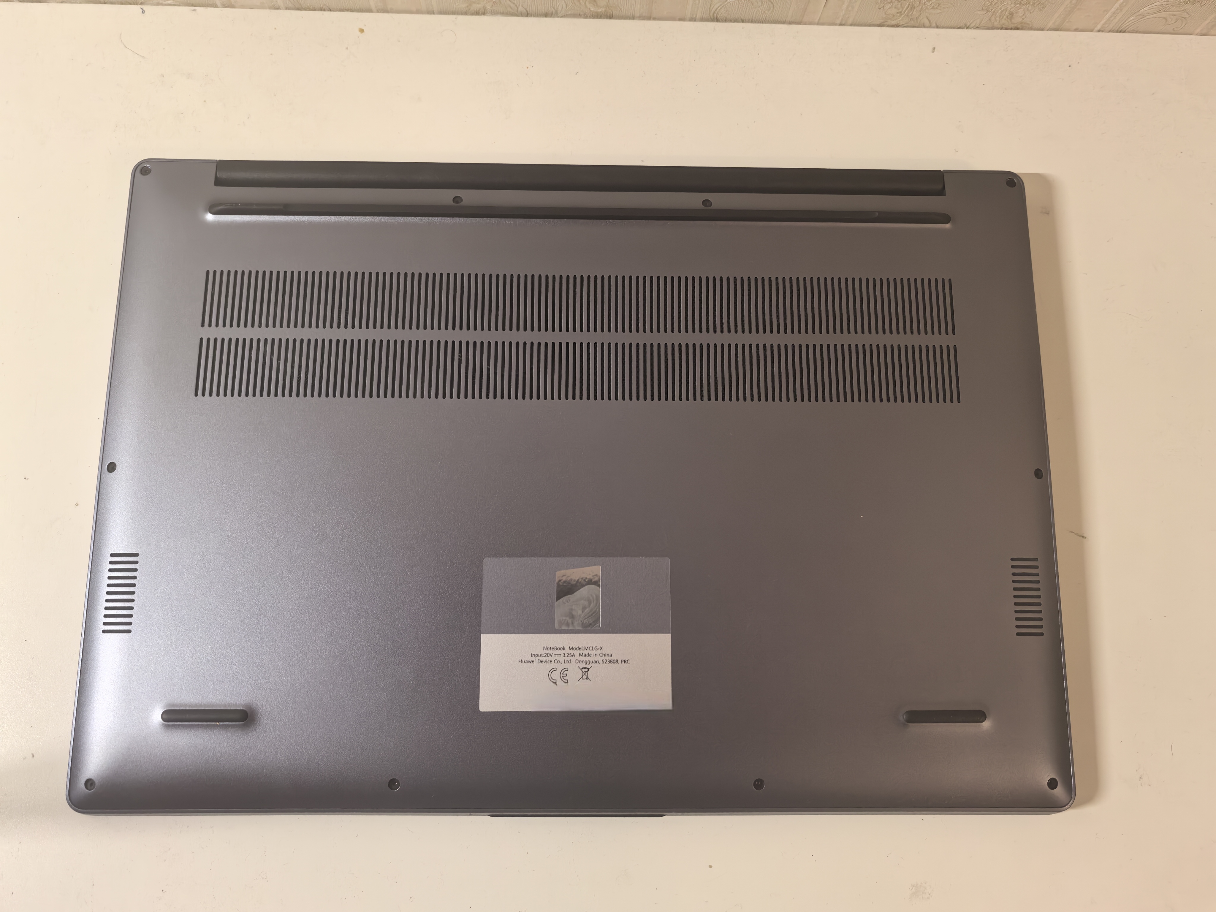 На лицевой стороне нанесено название бренда, с обратной — номер модели и две решетки радиатора. Корпус ноутбука — алюминий, что вызывает приятные и прохладные ощущения, когда держу его в руках. Вес у MateBook D16 2024 — 1720 г, что немного. Если держу его в одной руке на кончиках пальцев, то он ощущается, как тяжёлый. Это совершенно другие ощущения по весу, как если держать 980 г HUAWEI MateBook X Pro 2024, который примерно в два раза легче.
