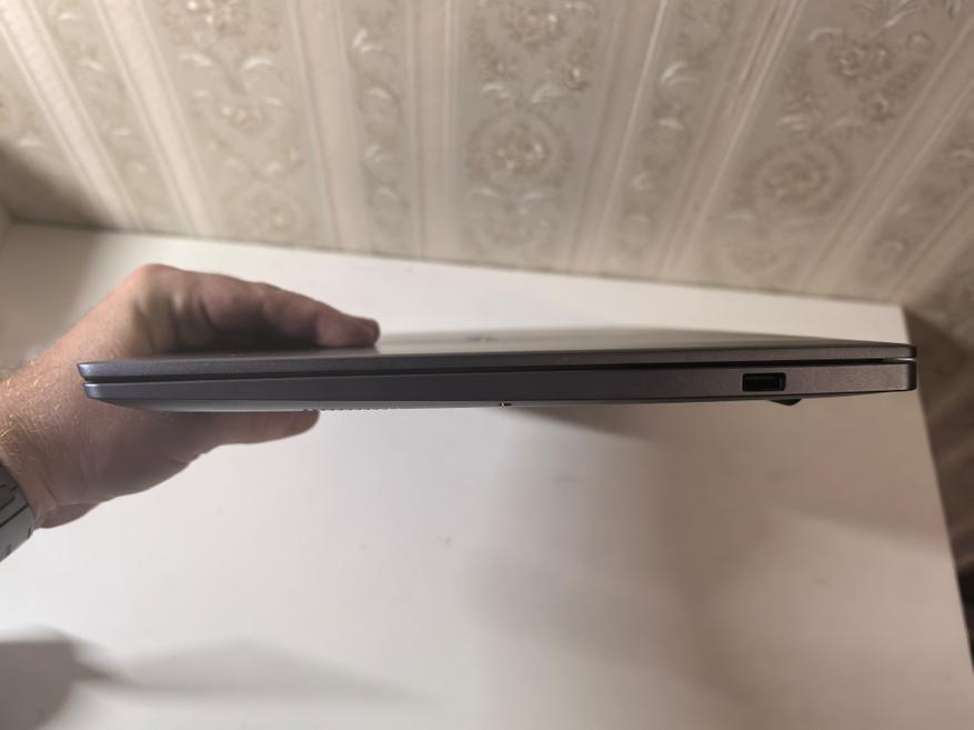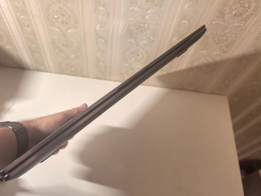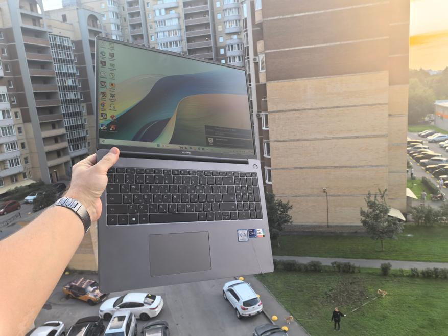 Экран может раскрываться на 180⁰. Интересная возможность, которой я было нашел применение, взяв в руки D16 и начав ходить по квартире, но радость была недолгой. Как только мне понадобилось написать или просто выполнить действие на экране, то стало неудобно удерживать 44 см ноутбука одной рукой и набирать или управлять мышкой через тачпад другой. Такой опыт использования был бы более выигрышным, если бы экран был сенсорный, но такой есть в немного другой модели, MateBook 16s, которая стоит дороже, имеет лучшие характеристики. Разложенный на 180⁰ ноутбук можно использовать для видеоконференций, шагая по помещению.