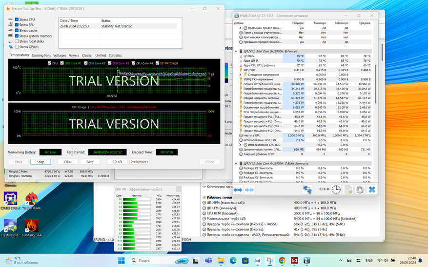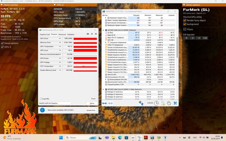 Попытался протестировать видеокарту, запустил ее разгон с помощью программы FutMark и вывел с помощью других программ информацию по TPD, частотам процессора. Видно, что в один момент частота на всех ядрах сильно поднялась. Вентиляторы работали относительно тихо. Шум от них был на уровне 43 дБ. Темепература не поднималась выше 79⁰С. Как только приближалась к этой отметке, падала из-за работы системы отвода тепла. Если правильно проинтерпретировал информацию на скриншотах ниже, критическая температура — 93⁰С.