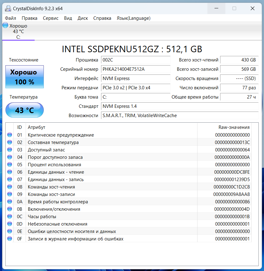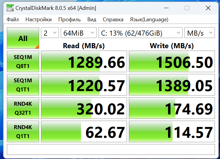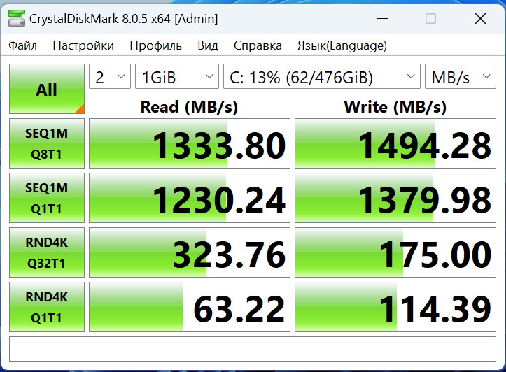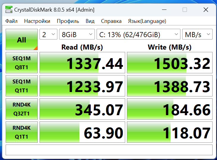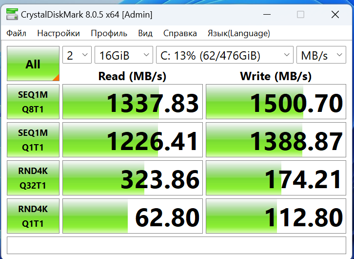 Ради интереса запустил тест скорости системного накопителя. Так как используется DRAM буфер, то и скорости записи практически на одном уровне со скоростями чтения. Быстрее по скорости доступа устанавливать накопитель смысла не имеет, а вот по объёму — вполне. Производитель допускает подобный апгрейд пользователем как оперативной памяти, так и системного накопителя без потери гарантии.