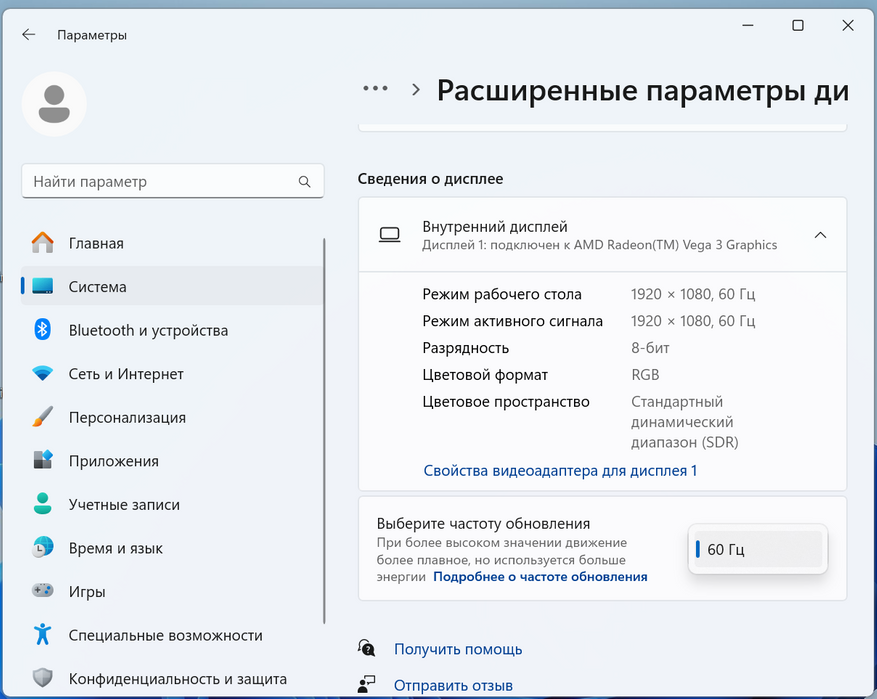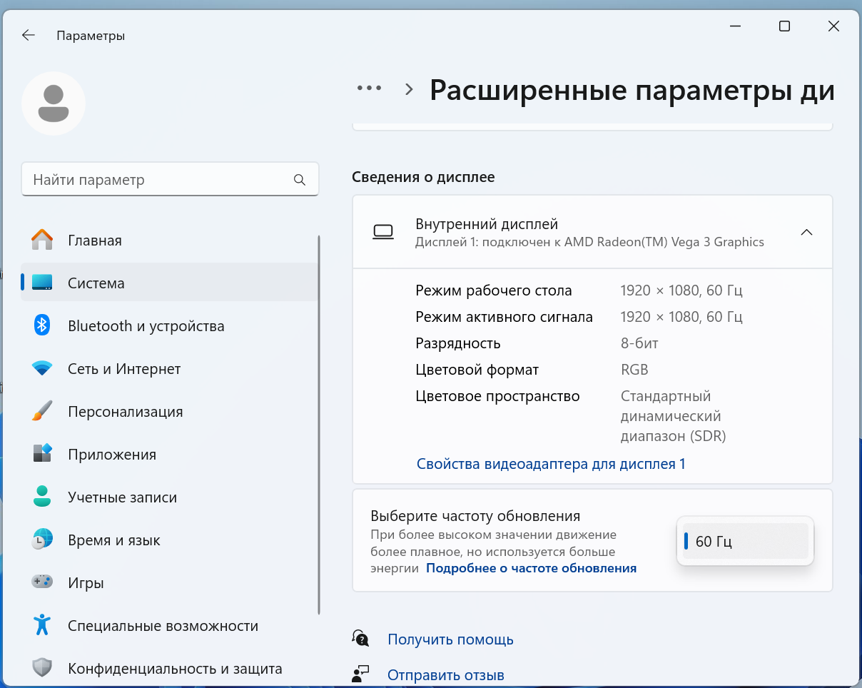 Ноутбук эксплуатирую примерно месяц, заметил, что работать можно практически в любом положении. Будь то подставки или же просто столик в кафе, на коленях в парке на лавочке, словом, углы обзора позволяют. Установлена неплохая матрица BOEhydis NV140FHM-N48 с FullHD разрешением. Частота обновления 60 Гц, если подключать внешний монитор через HDMI, то можно будет установить частоту до 100 Гц при условии поддержки монитором.