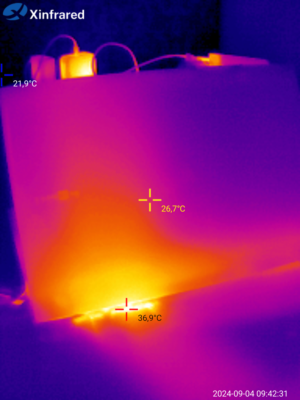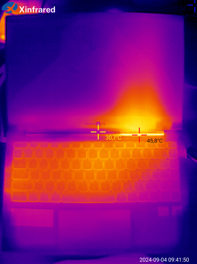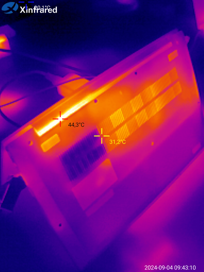 Стоит отметить, что данный ноутбук не относится к «горячим» моделям — во время непрерывных тестов температура находилась на уровне 65 градусов (максимальное значение — 72 градуса). Типовое значение TDP для процессора AMD Ryzen 3 3200U заявлено в 15 Вт. Во время теста значение было на уровне 13-14 Вт. Если обратили внимание на падение температуры градусов на 5 — это на отметке 45…47 минут я выполнял снимки с тепловизора, приподнял ноутбук и перевернул его. Очевидно, что отвод тепла стал лучше. Можно сделать вывод, что на подставке охлаждение будет работать эффективнее.