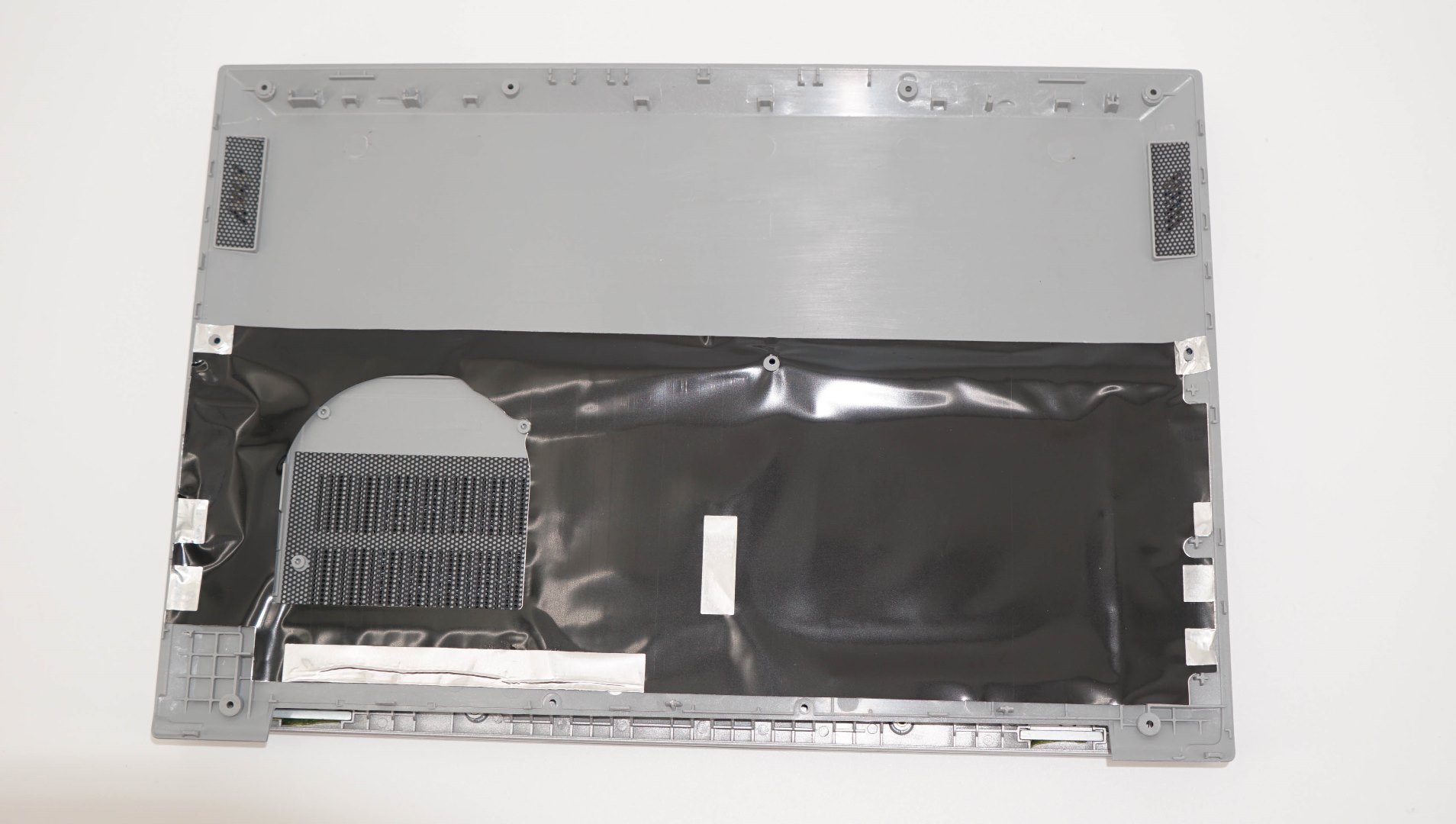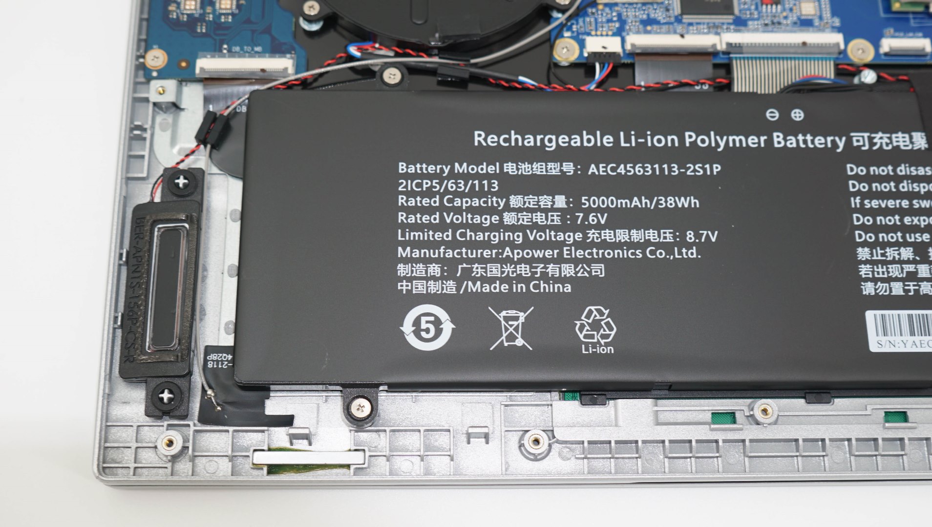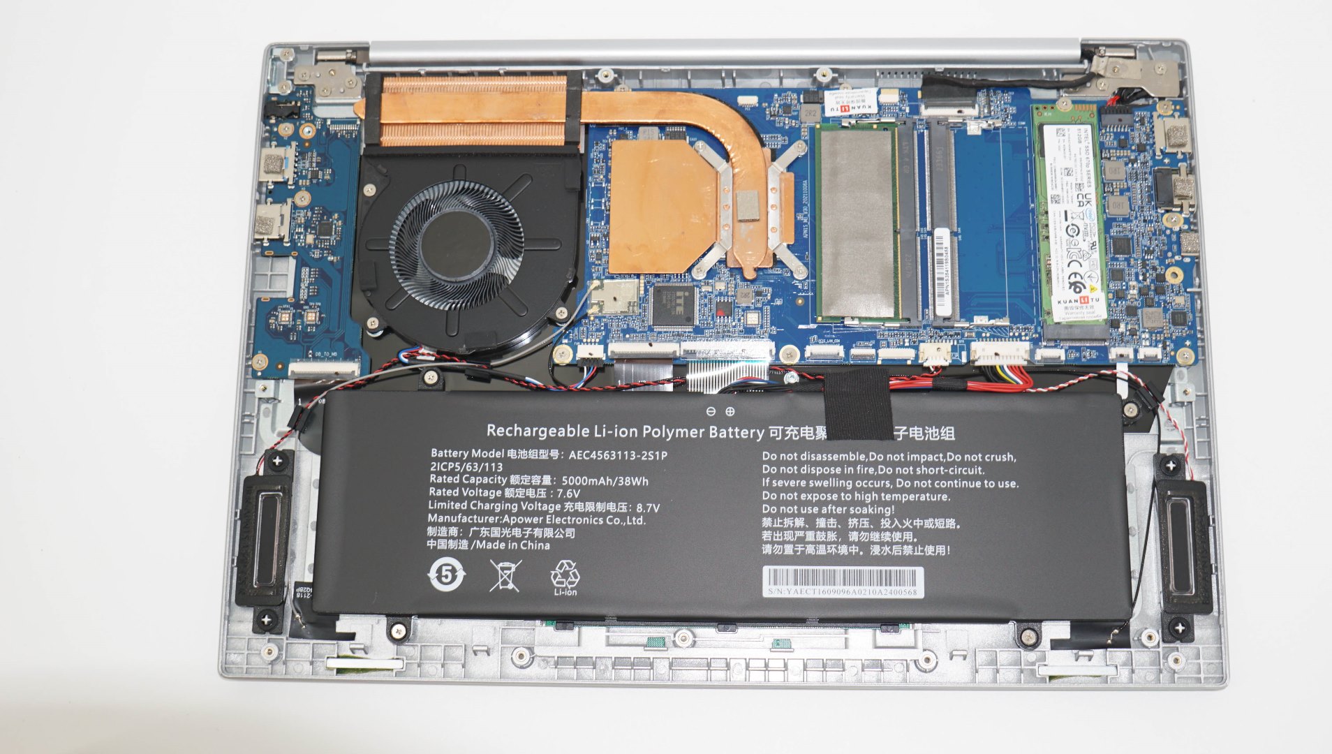 С целью подтверждения характеристик и для уточнения компонентов аппаратной платформы, я разобрал ноутбук. Крышка снимается достаточно просто. Внутри видна сетка-фильтр, изоляционная прокладка на крышке, а также широкая аккумуляторная батарея и основная плата ноутбука. Система охлаждения базируется на массивной тепловой трубке с медным теплообменником. Вентилятор один, в виде мини-турбины.