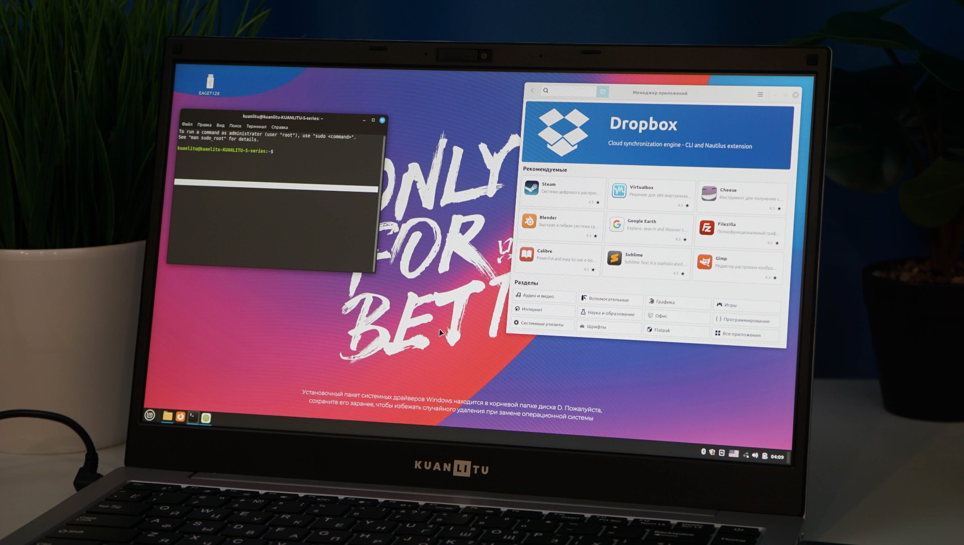 Как я уже сказал в самом начале, на ноутбуке установлена операционная система Linux Mint — бесплатная операционная система, за использование которой пользователь не переплачивает. В пользовательской папке находится архив с драйверами, позволяющими установить операционную систему Windows. Если планируете самостоятельно переставить систему — предварительно сохраните архив. Что же касается Linux Mint, то это полноценная рабочая система с двумя офисными пакетами, прекрасно работающая в браузере, оснащённая менеджером приложений для быстрого скачивания и установки необходимых программ.