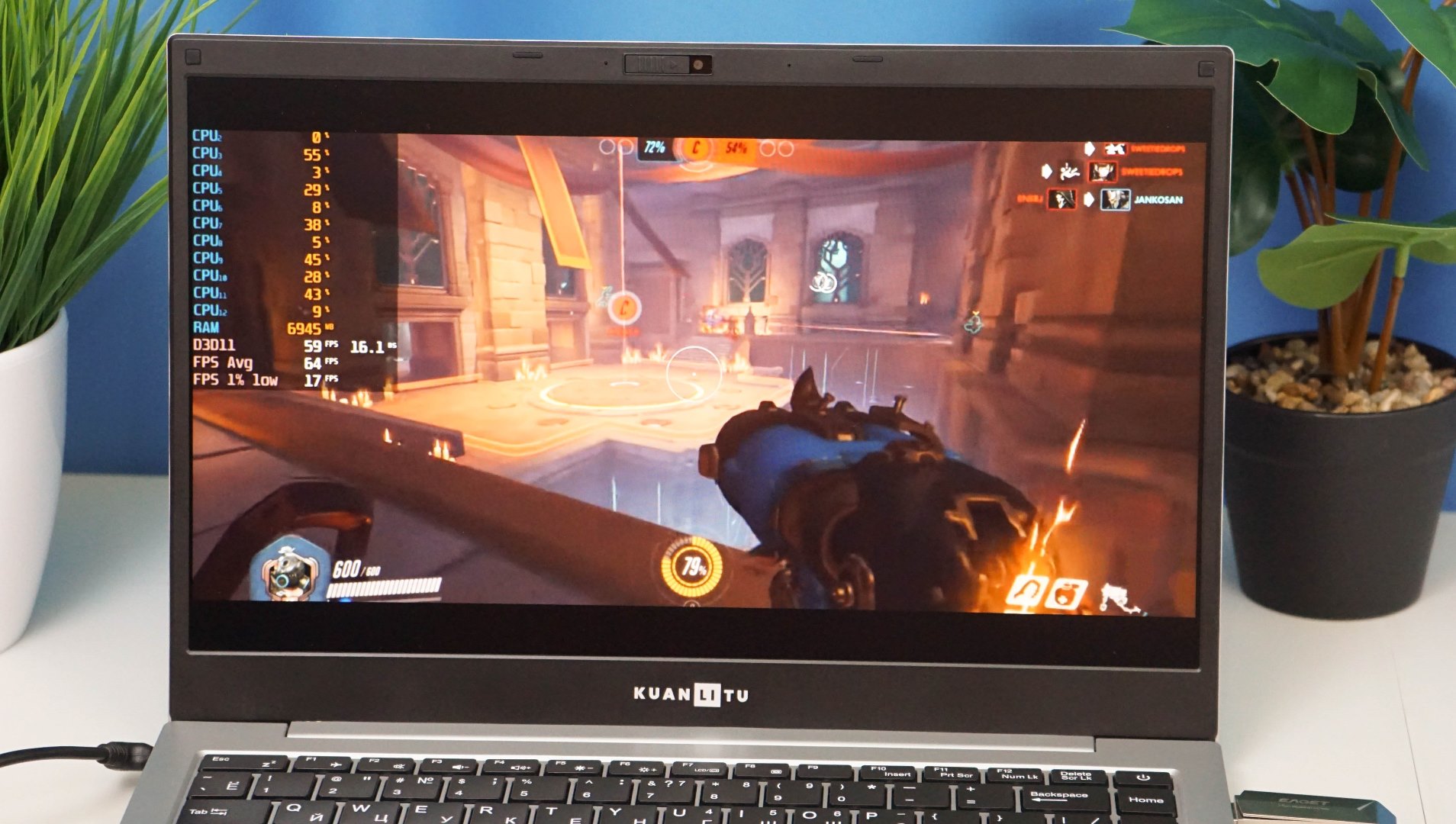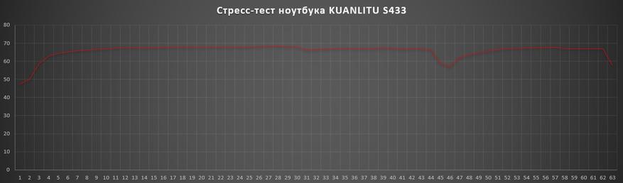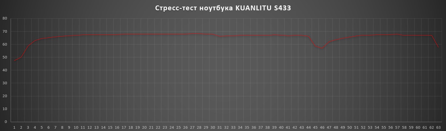 Ноутбук KUANLITU S433 отличается тихой работой и отличной производительностью, которой хватает для базовых задач и повседневных нужд. Во время длительного теста температура не превышала 45-47 градусов, а уровень шума при максимальной загрузке процессора — не превышал 25 дБ. Термальный троттлинг не зафиксирован.