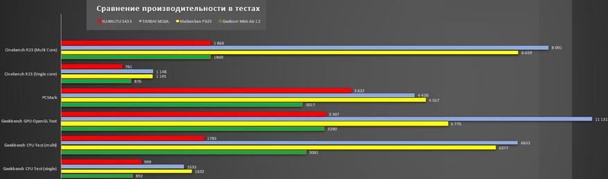 Для удобства сделаю сравнительный график с базовыми тестами нетбуков, неттопов и ноутбуков из предыдущих обзоров: Tanshi M16A, Maibenben P625, Geekom Mini Air 12. Разницу в производительности можно оценить наглядно.