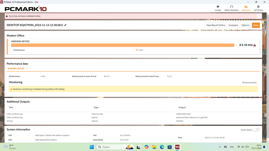 Также хочу добавить результаты тестирования аккумулятора при помощи программы PC Mark. В этом случае я выставил яркость экрана на 60%, что является для меня комфортным значением для работы в помещении с легким фоновым освещением. В режиме Modern Office ноутбук проработал 8 часов 10 минут. Т. е если не нагружать его тяжелыми задачами и выставить средний уровень яркости, то заряда вполне хватает на полный рабочий день.