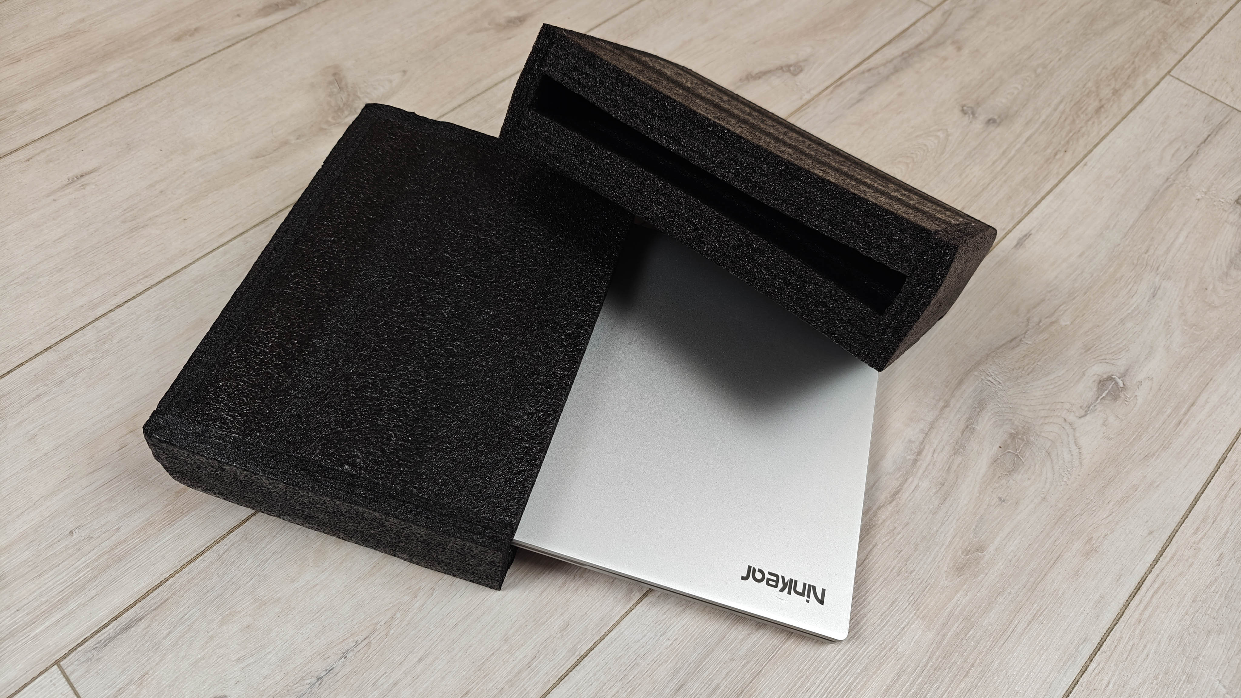 Основная защита это оболочка из вспененного материала, которая со всех сторон закрывает ноутбук. Такой способ защиты китайцы придумали несколько лет назад, а сейчас он используется повсеместно и стал золотым стандартом. И ведь действительно я не раз сталкивался с ситуацией, когда картонная коробка была примята в углу или имела другие повреждения, но ноутбук внутри оставался абсолютно невредимым.