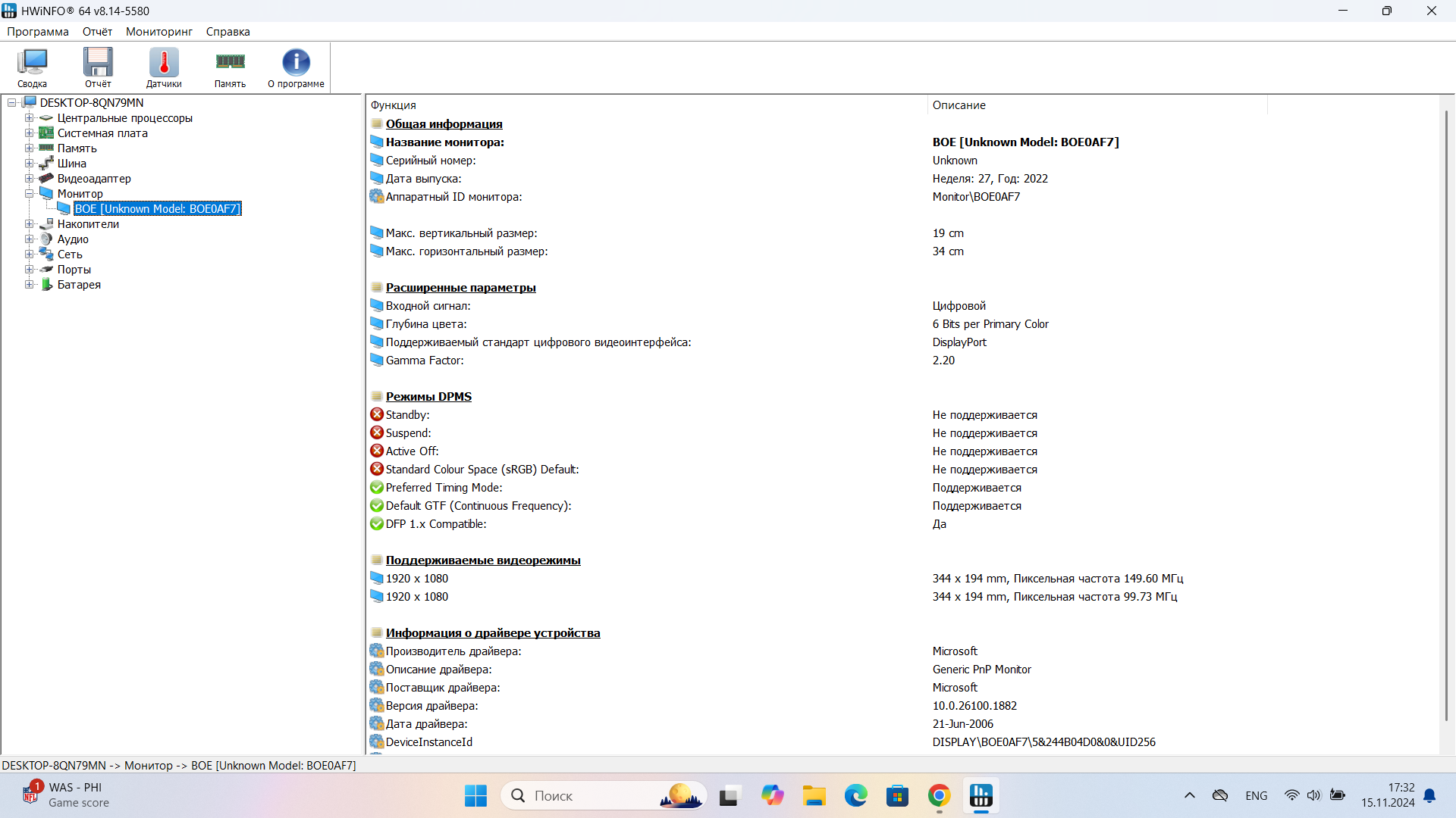 Чего не могу сказать о дисплее. Согласно утилите Monitor Asset Manager здесь использовали бюджетную IPS Full HD панель BOE0AF7 с частотой обновления 60 Hz.