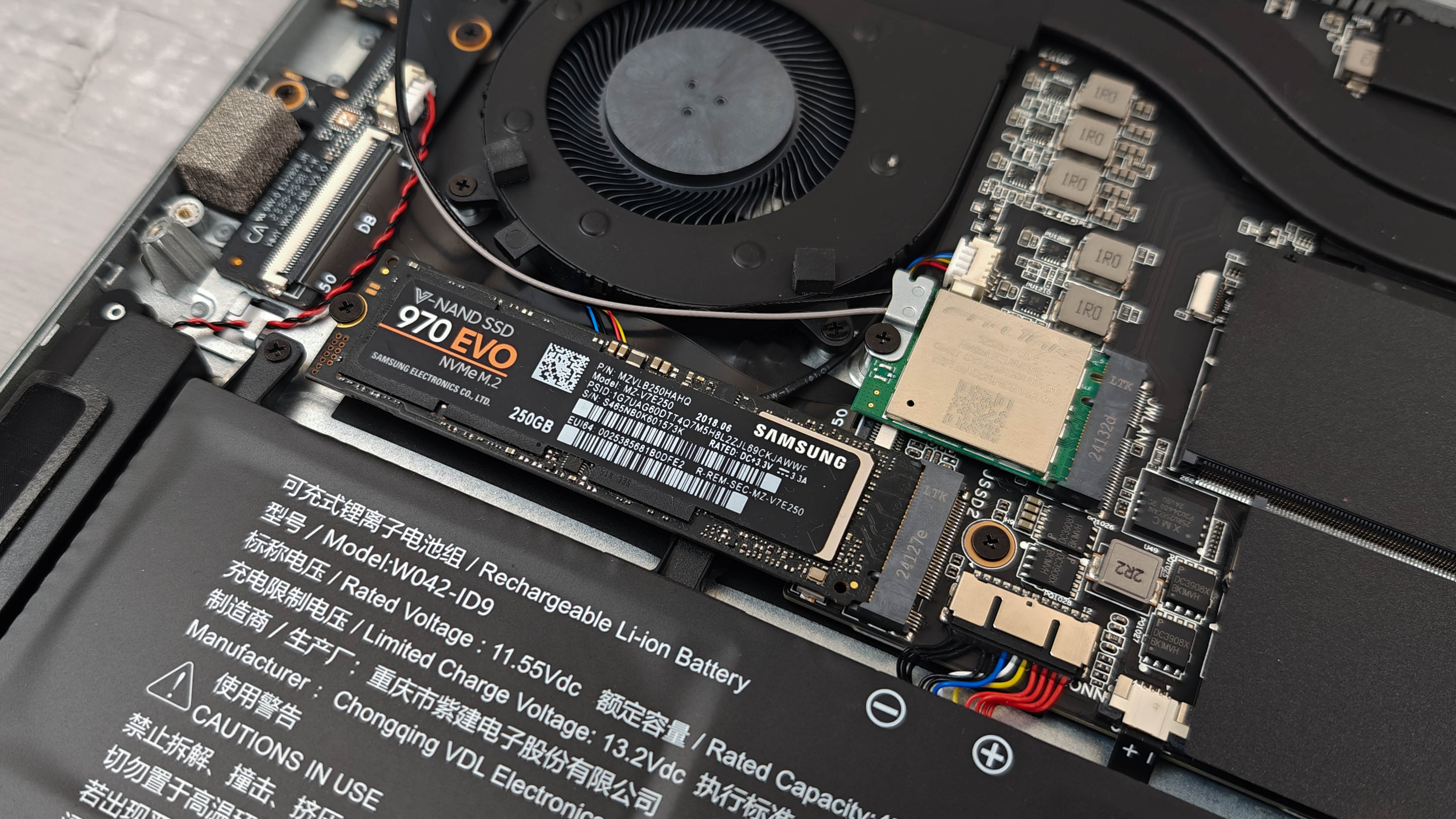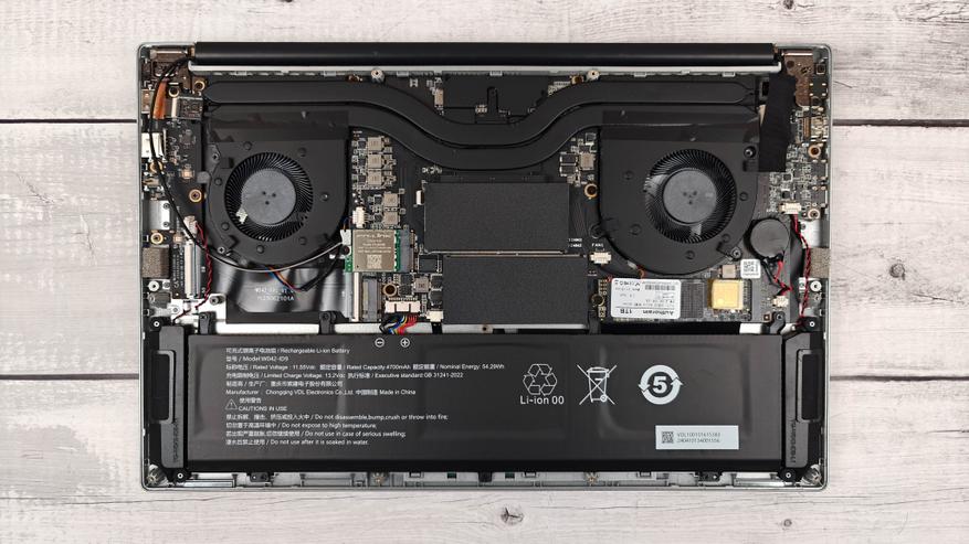 Компоновка ноутбука максимально эффективная, неиспользуемого пространства внутри практически нет. Двойная система охлаждения с общими трубками выглядит обещающе, общая площадь меди достаточно серьезная. Оперативка по центру закрыта антистатической пленкой, правее можно заметить SSD формата 2280, а в нижней части расположился длинный аккумулятор, состоящий из 3 элементов.