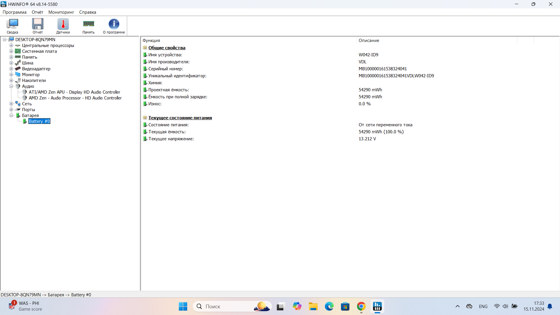 Рассмотрим все в деталях. Li-ion аккумулятор с модельным номером W042-ID9 и номинальной емкостью 54,29 Wh.