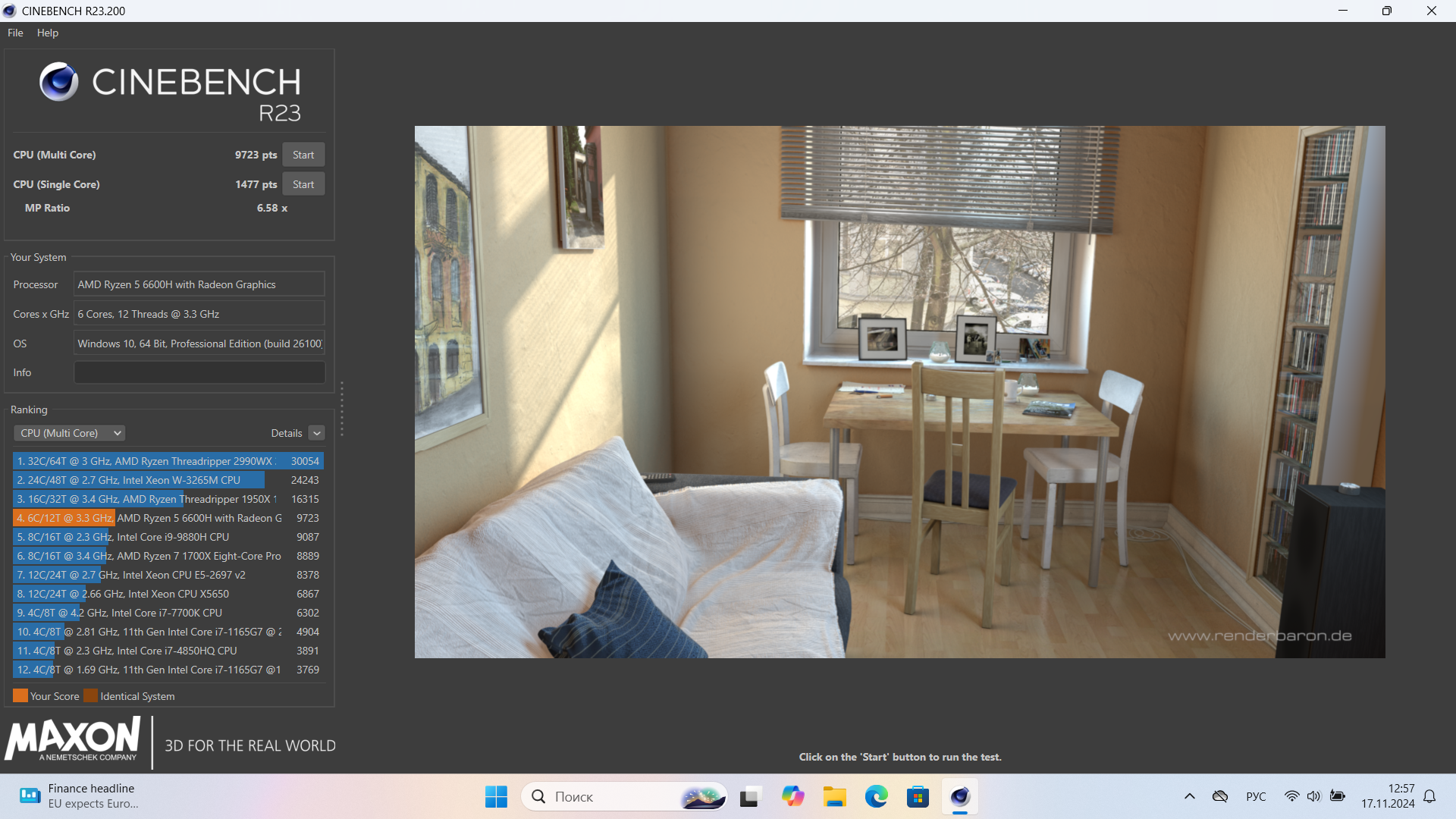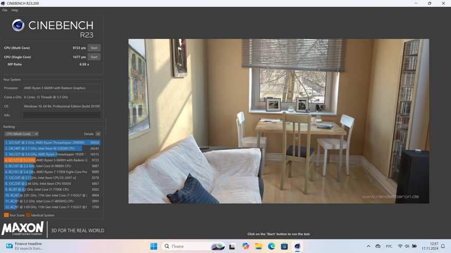 В Cinebench R23 ноутбук Ninkear A15 Pro набрал 9723 балла в многоядерном режиме и 1477 баллов в режиме одного ядра. В этом бенчмарке он оказался немного слабее, чем Ninkear N16 Pro 2024 на базе Core i7 13620H (9876\1737 баллов соответственно). Однако давайте не будем забывать, что Ryzen 5 6600H это 6 ядер\12 потоков, а Core i7 13620H это 10 ядер\16 потоков. И разница не так чтобы и уж очень сильная, при этом в графических тестах Ryzen 5 6600H показал себя куда лучше.