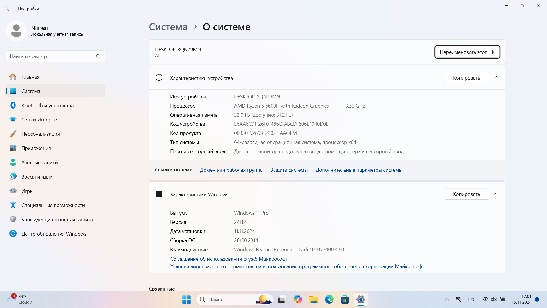 Ninkear A15 Pro поставляется с предустановленной операционной системой Windows 11, лицензионный ключ вшит в биос. Во время тестирования переустановил систему на другой SSD-диск, после чего установил Windows с официального сайта Microsoft и лицензия подтянулась автоматически. Драйвера есть на официальном сайте, в автоматическом режиме определились не все устройства.