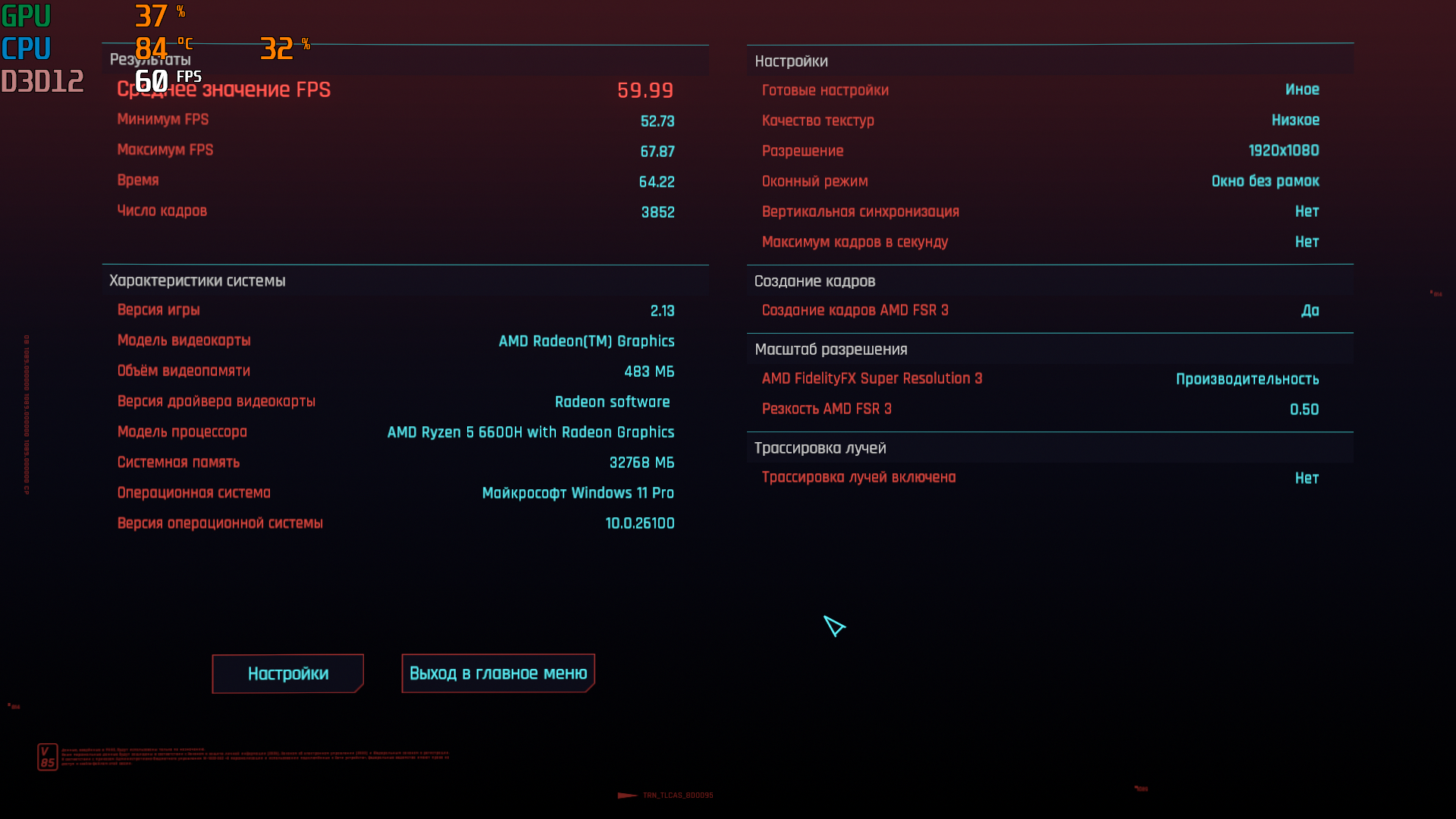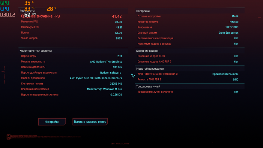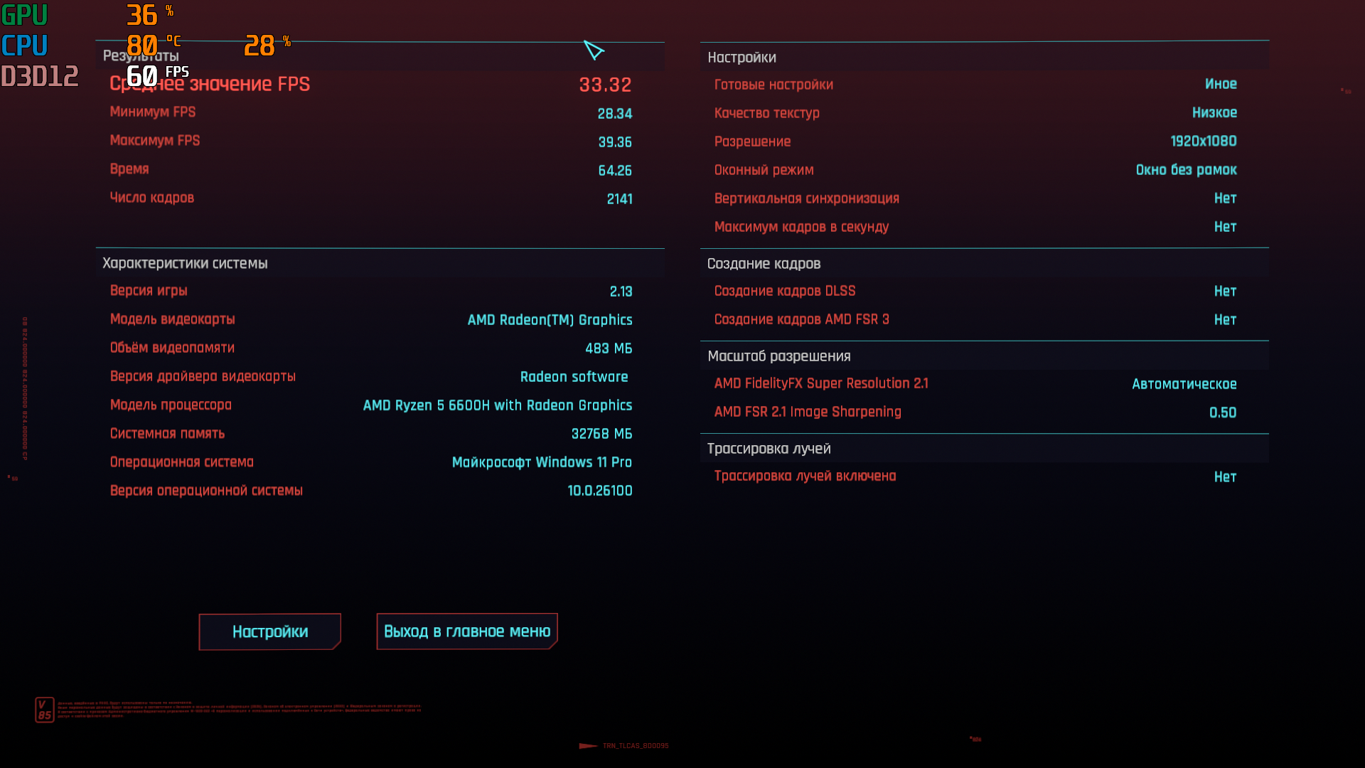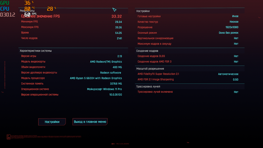 И тогда я обнаглел окончательно, установив Cyberpunk 2077. На Full HD разрешении и пресете высоких настроек игра выдала средние 13 FPS, что естественно не играбельно. А вот с пресетом низких и AMD FSR на автоматических настройках она вполне бодро пошла с 33 FPS.