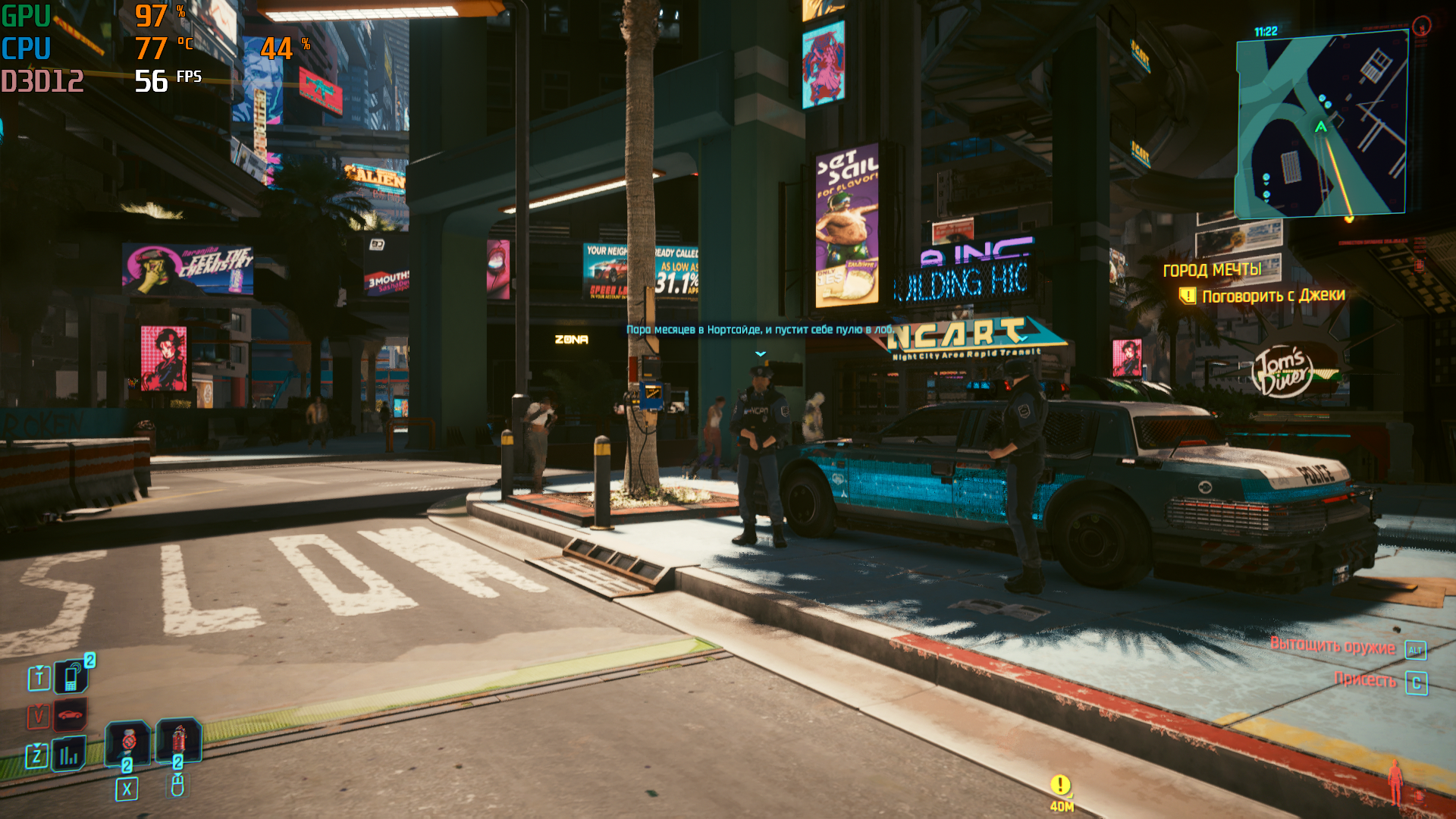 Понятно, что графон заметно упрощен, ведь все-таки ноут не игровой, но поиграть в Cyberpunk 2077 с FPS близким к 60 это мега круто.
