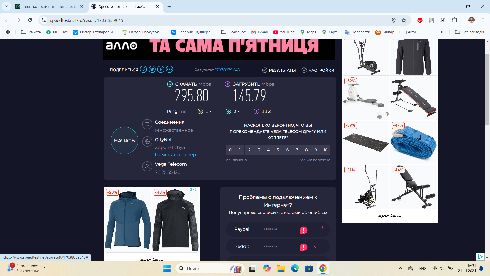 Даже в диапазоне 2,4 GHz, где мои домашние устройства показывают 40 — 45 Mbps, ноутбук выдал почти 300 Mbps на скачивание и 150 Mbps на загрузку.