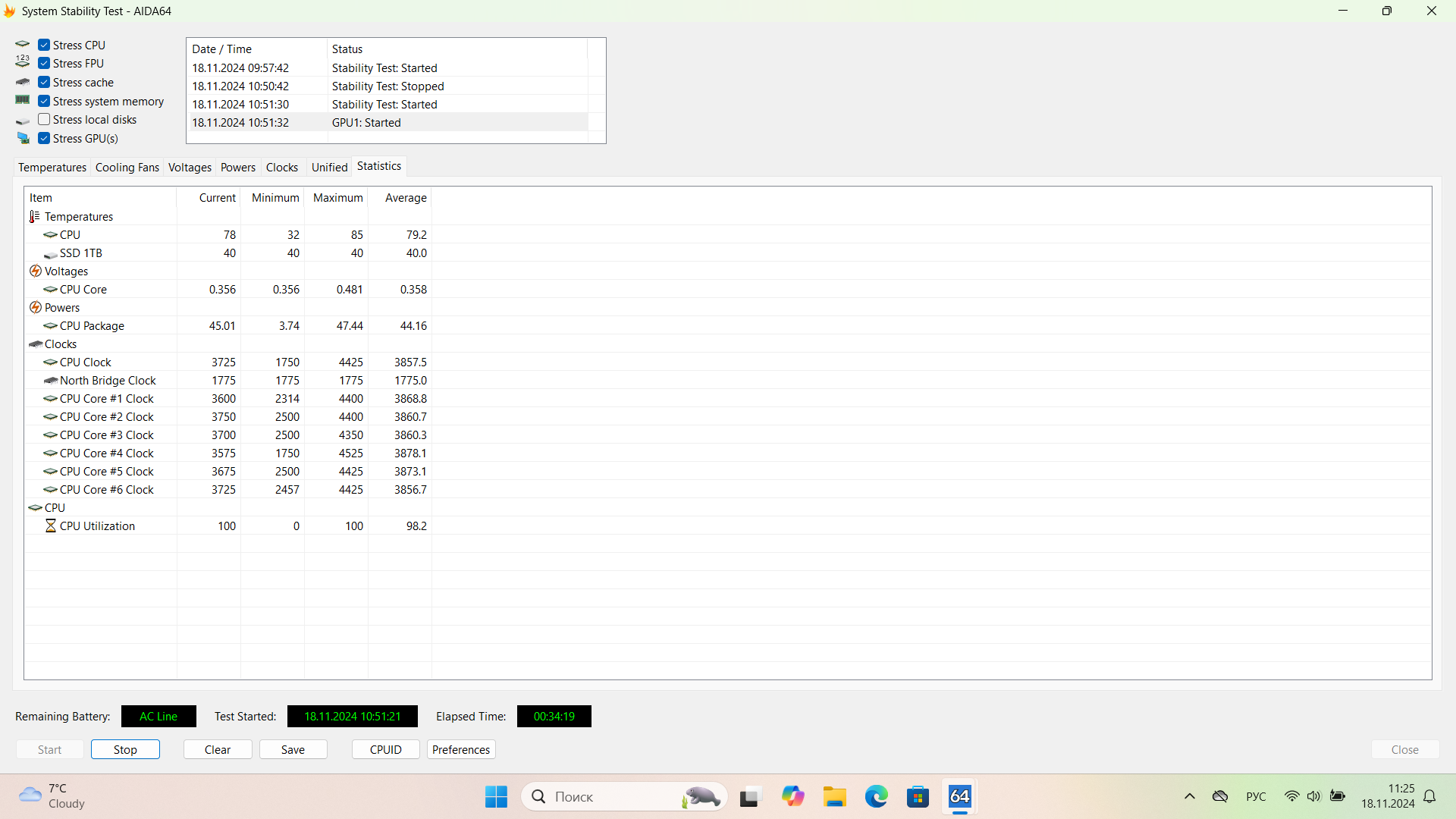 Если посмотреть в статистику, то можно увидеть, что максимальная температура зафиксированная на процессоре была 85 градусов. Это в момент старта максимальной нагрузки. Потом начинают работать вентиляторы и температура падает. Кстати, в спокойном рабочем режиме, когда вы пользуетесь браузером или смотрите видео, температура процессора находится в пределах 40 градусов, при более активном использовании обычно не превышает 60, в играх возростает до 80 градусов. Напомню, что Tjmax процессора (температура при которой начинается троттлинг) составляет 100° С, т. е запас весьма приличный.