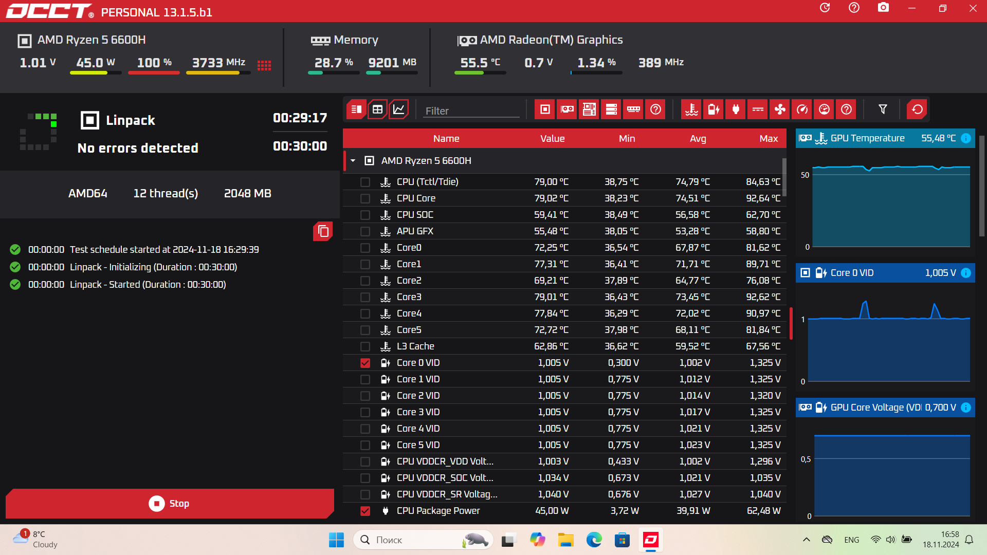 Пауза 1 минута и снова стресс тест, но уже с максимальной нагрузкой CPU + GPU. Т. к тепловой пакет все те же 45W, то вполне понятно, что частота процессора снизится. Утилита показала частоту 3,6 — 3,7 GHz, но вместе с ней упала и температура до 77 — 80 градусов.